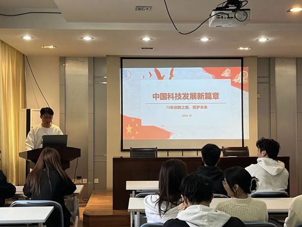 随后,砼研新语社副社长刘畅同学以“中国科技发展新篇章-75年创新之路,筑梦未来”为主题,给同学们做了学习报告。刘畅同学从科技创新的背景、科学技术重大突破、科技创新的影响、科技创新的展望四个方面强调了科技创新发展的重要性,指出了科技创新是增强国家核心竞争力的重要手段,技术自主和创新能力的提升有助于在全球竞争中占据优势,同时,科技创新可以带动新兴产业崛起,推动传统产业的转型升级,促进经济高质量发展。