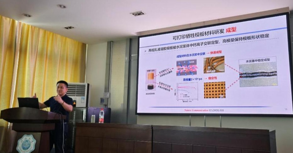 讲座中,董教授围绕“仿生混凝土设计理念与实现方法”展开深入阐述。首先,他回顾了滨海基础设施中混凝土材料的发展历程,分析了当前面临的氯离子诱发钢筋锈蚀、混凝土性能劣化等挑战,强调这些问题导致重大经济损失和安全风险,亟需新型防护技术。接着,结合自身在固体废弃物资源化和绿色建筑材料领域的丰富研究经验,以及团队的最新云开电竞app下载地址,分享了一系列独到的见解和创新性的研究思路。例如,在氯离子靶向抑制技术方面,董必钦教授提出了仿生人体循环系统的设计理念,通过构建混凝土三维管路传输网络和嵌入式3D打印方法,发明可打印、易成型、自消除的管路模板材料,实现了氯离子的靶向识别与抑制。这一创新方法解决了传统防护措施修复功能单一、防护周期有限的问题,为滨海混凝土结构的可持续运维提供了全新理论参考和技术支撑,内容引起了在场师生的浓厚兴趣。