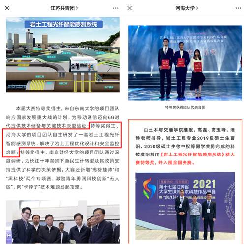 2021年5月,第十七届“挑战杯”全国大学生课外学术科技作品竞赛江苏省决赛在南京举办。高磊老师指导的研究生团队共同完成的科技发明制作《岩土工程光纤智能感测系统》获江苏省特等奖,并入围全国决赛,取得了开云电竞网土木与交通学院的历史最好成绩。