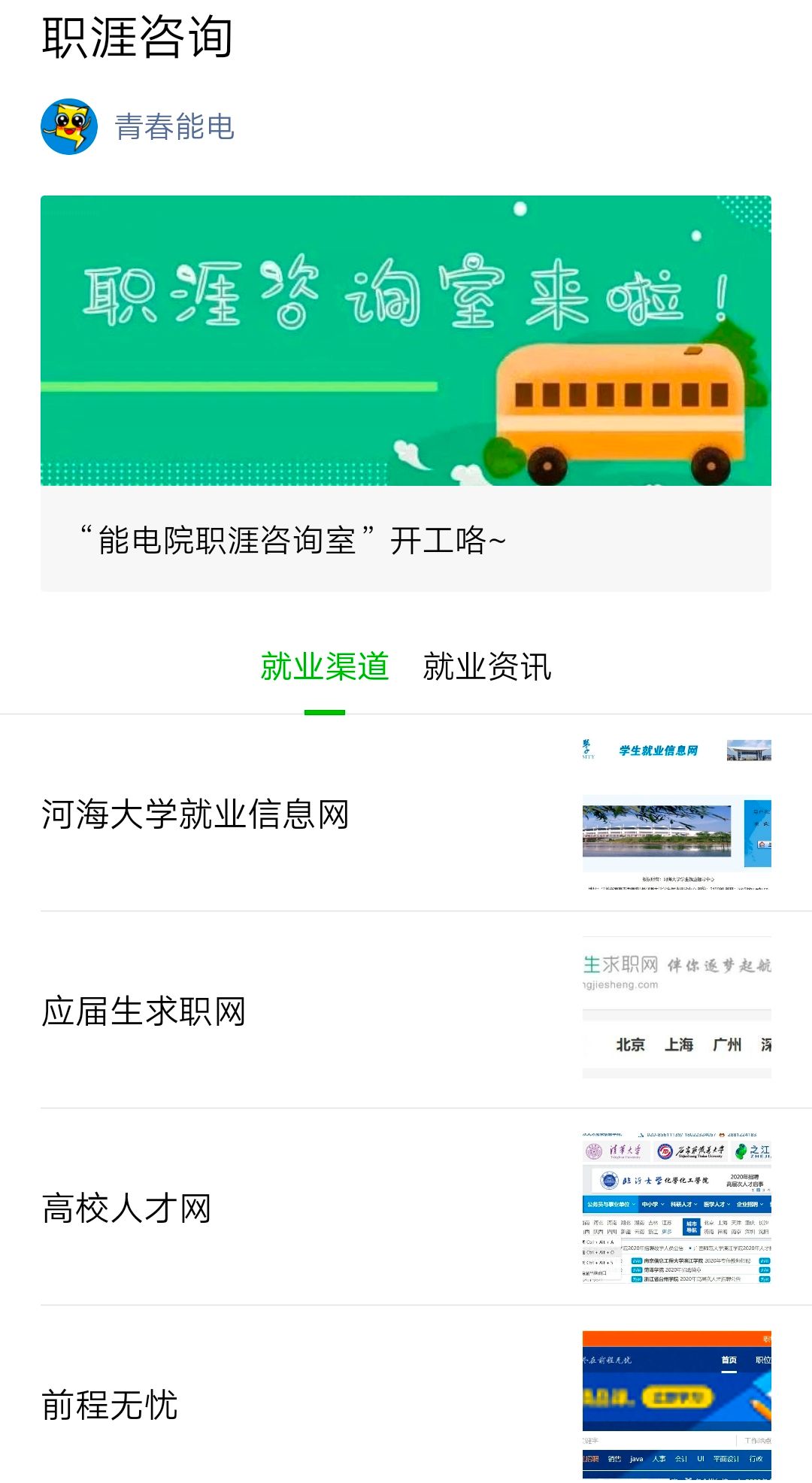 职涯咨询依托“青春能电”微信公众平台通过线上开展。学院开放一对一师生咨询通道,以线上预约、语音答疑的方式打造“能电职涯咨询室”,为学生提供针对性强、实用性高的生涯指导及就业资讯。目前咨询已开展四期,师生反馈良好。