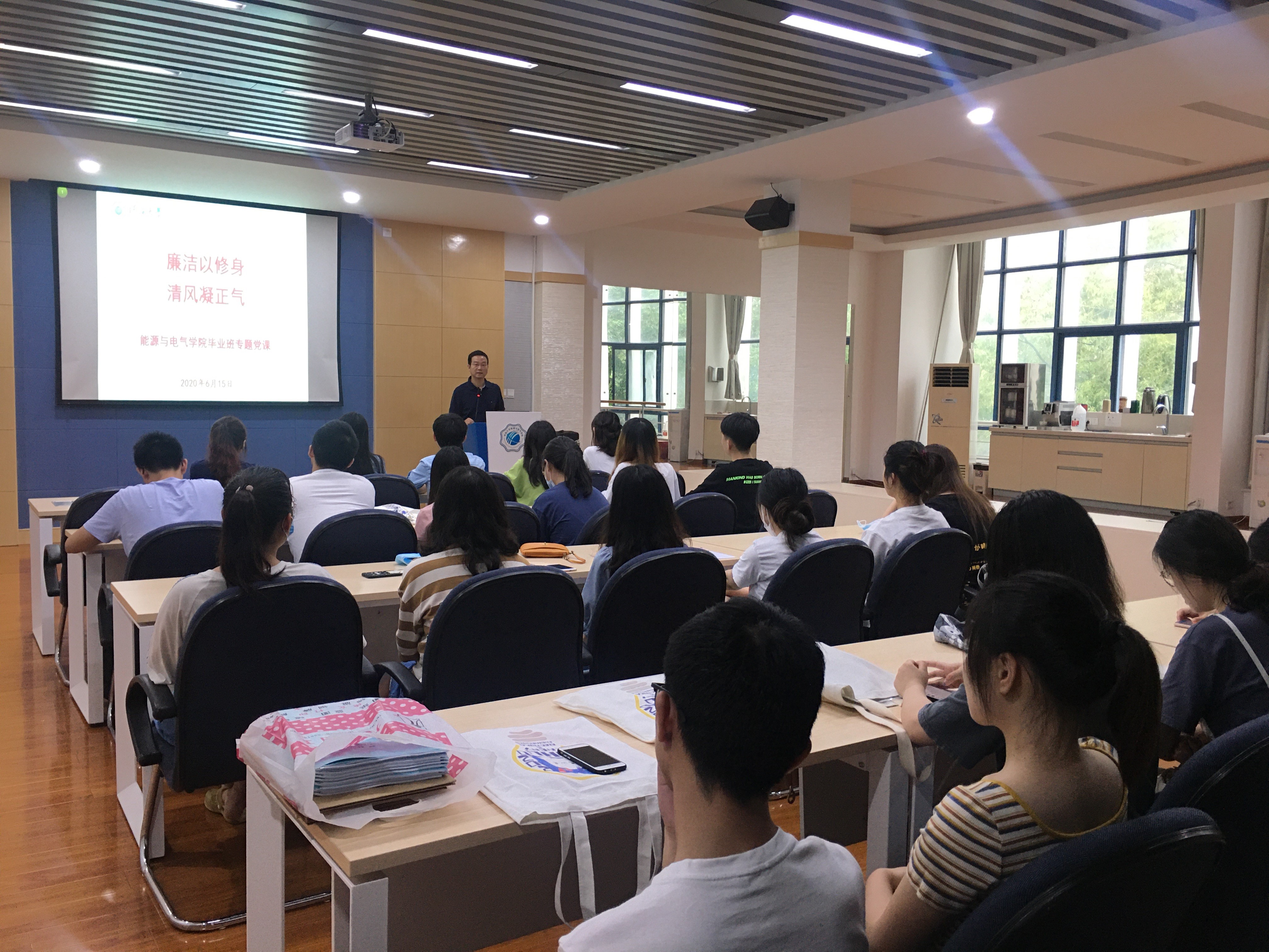 2020届本科生毕业前夕,能源与电气学院开展了以“廉洁以修身,清风凝正气”为主题的专题党课。学院党委书记娄健主讲,全体毕业班学生党员参与学习。