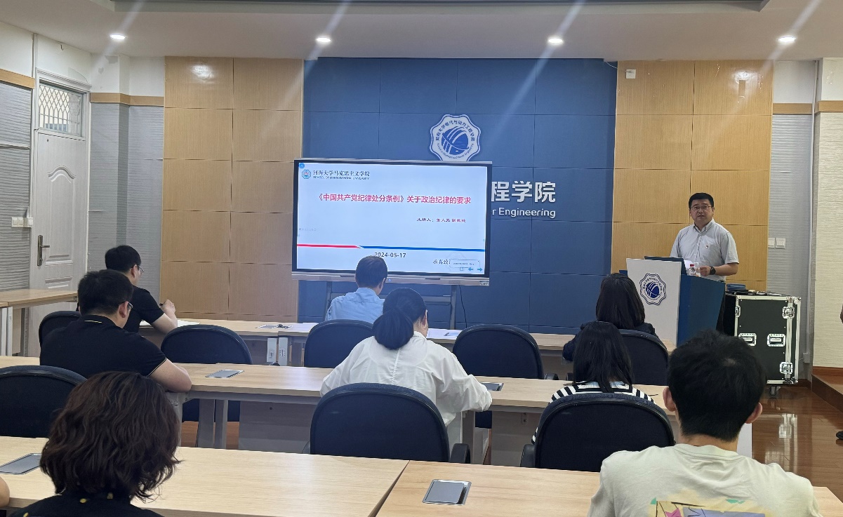 5月17日,我院举行《中国共产党纪律处分条例》(以下简称《条例》)专题辅导报告会,马克思主义学院副教授董大亮作辅导报告。学校党纪学习教育联络员刘丹平书记、学院领导班子成员、党委委员、党支部书记、师生党员代表等参加了报告会,院党委书记吴洪彪主持报告会。