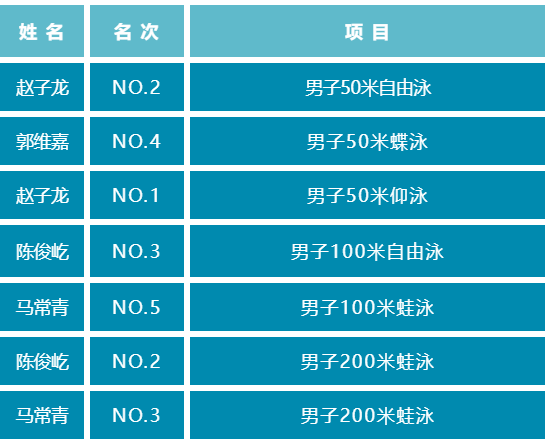 本次比赛分为男子组和女子组,共有50米蝶泳、50米仰泳、50米蛙泳、50米自由泳、100米自由泳、100米蛙泳、200米自由泳、200米蛙泳八种项目。我院共有8名学生参赛,经过激烈角逐,获得男子50米仰泳第1名、男子50米自由泳第2名、男子200米蛙泳第2名、男子200米蛙泳第3名、男子100米自由泳第3名等成绩,展现了电气学子的拼搏精神和昂扬锐气。