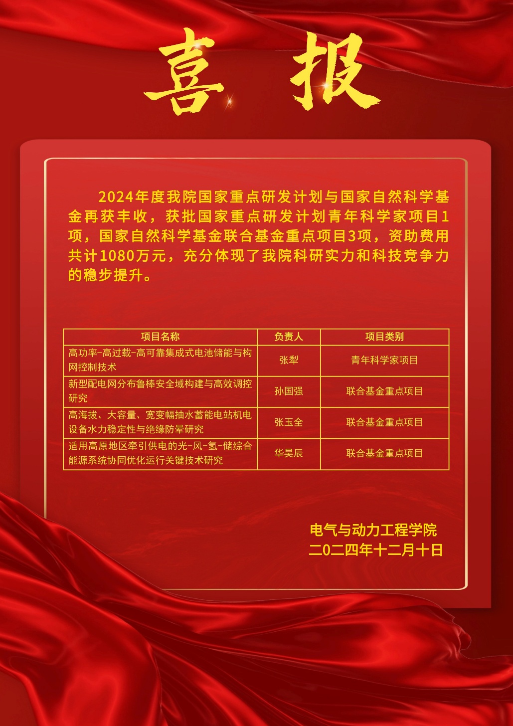 2024年度我院国家重点研发计划与国家自然科学基金再获丰收,获批国家重点研发计划青年科学家项目1项,国家自然科学基金联合基金重点项目3项,资助费用共计1080万元,充分体现了我院科研实力和科技竞争力的稳步提升。