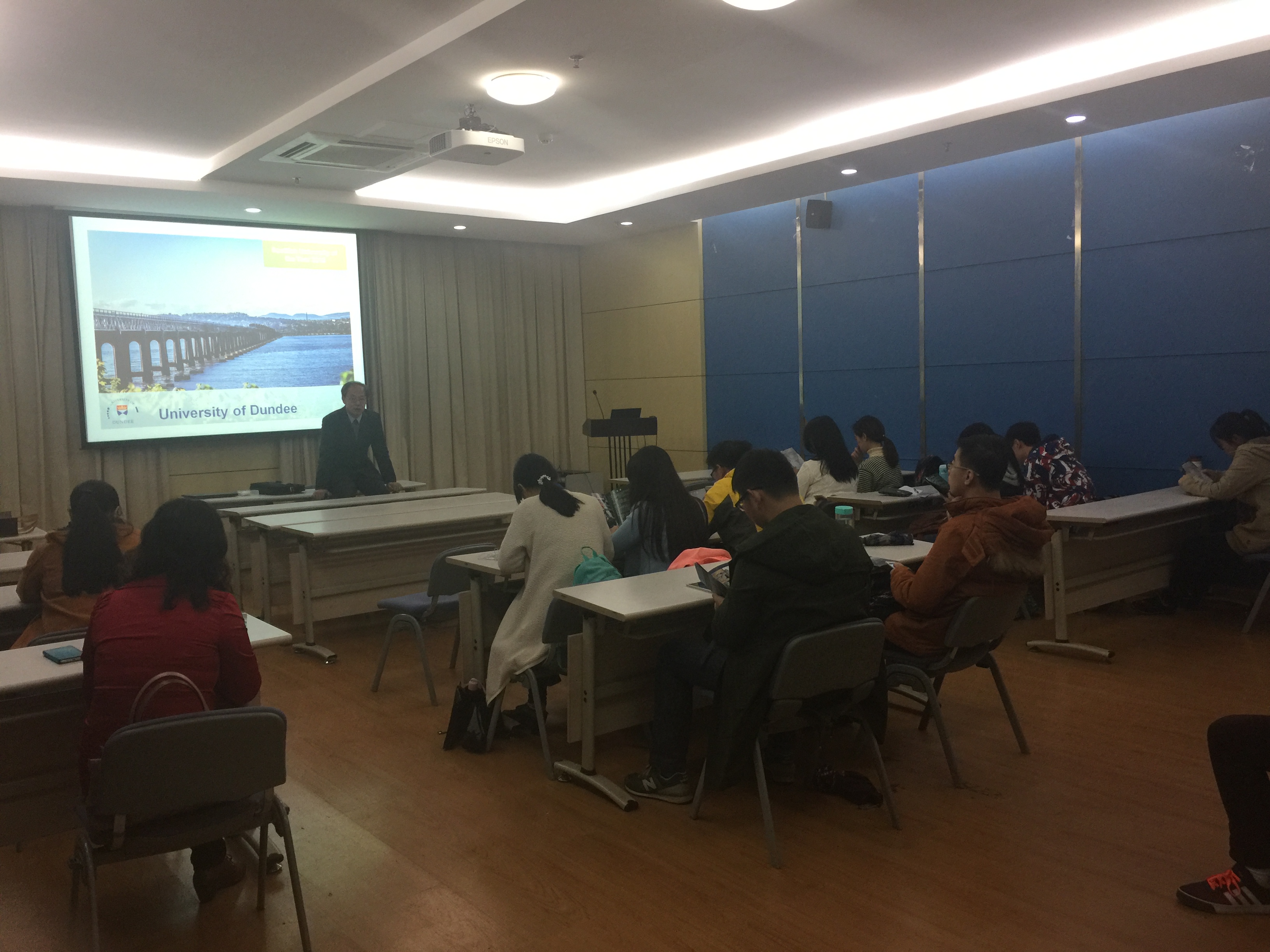 10月31日,英国邓迪大学工程与科学学院的董平教授访问我校,在校本部闻天馆举行了“3+1+1”本硕连读项目的宣讲会。会上,董平教授就邓迪大学的学院、专业设置、办学特色等方面做了深入、生动的说明,着重就“3+1+1”项目的优势、要求及费用进行了介绍,此外,还介绍了邓迪这个城市的地理位置及风土人情,并现场解答了学生的疑问。
