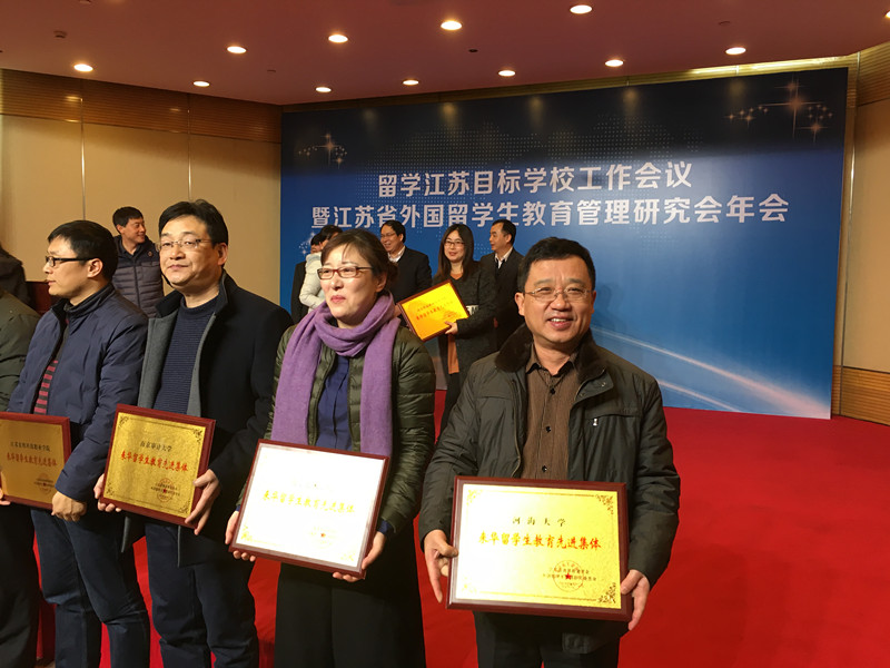 111日,在苏州大学举办的留学江苏目标学校工作会议暨江苏省外国留学生教育管理研究会年会上,我校荣获2015-2016年度江苏省外国留学生教育管理先进集体称号。江苏省教育厅王成斌副厅长为获奖学校颁奖。