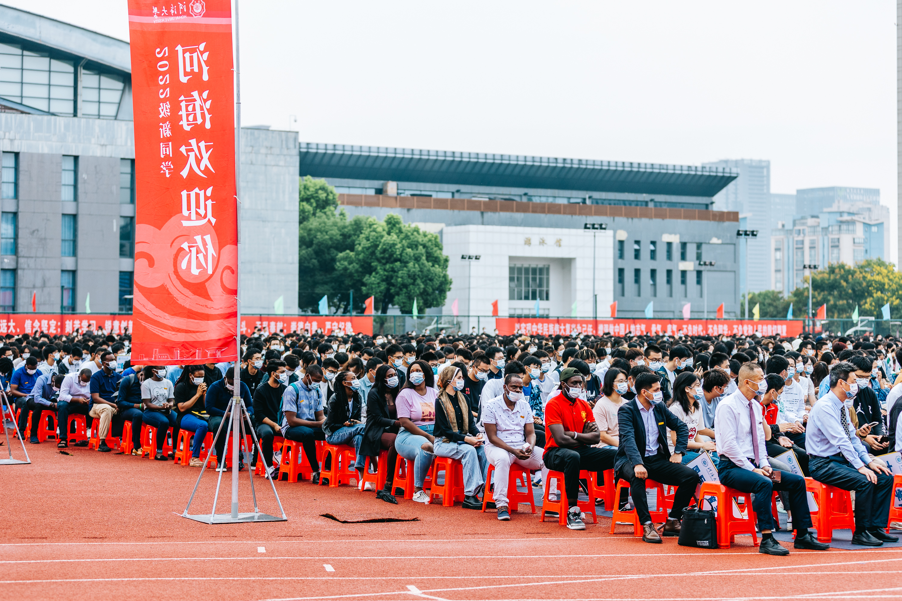 9月16日上午,我校2022年开学典礼在江宁校区体育场举行。学院院长陈红胜、书记任海莹及部分老师代表参加活动。典礼以线上、线下结合方式进行,来自12个国家的20名留学生新生代表现场参加开学典礼,其他新生通过直播观看典礼。