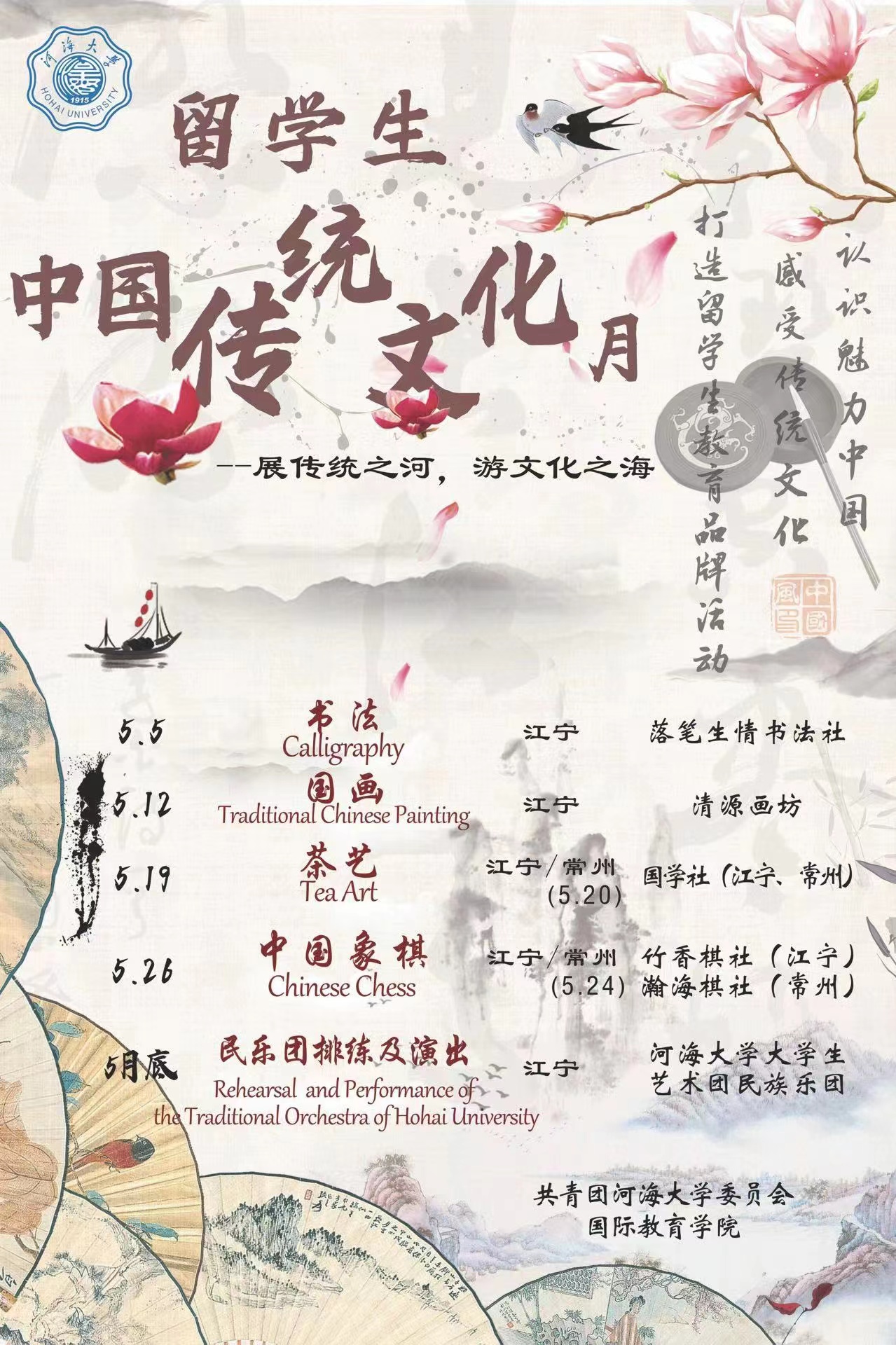 在传统文化体验月期间,国际教育学院汉语中心将开展一系列特色活动,组织留学生报名参加书法、国画、围棋、茶艺、民乐演奏等异彩纷呈的体验活动,从亲身经历中体悟中国传统哲学思想和价值观念,帮助他们更好地认识当今中国,增强对中华文化的理解与认同,成为促进中外文化交流的使者。