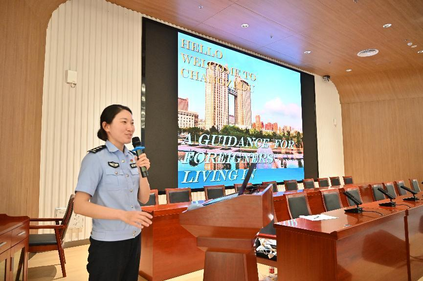 随后,国际教育学院开展2023级常州校区来华留学生新生入学教育。常州市公安局金坛分局出入境管理大队李晨警官从出入境管理制度、中国法律法规等方面展开多角度、深层次宣讲。学院教师围绕价值引领、教学事务、校园安全和日常管理等主题进行介绍,帮助新生尽快适应新环境,融入校园生活,科学做好规划,传播中国声音。