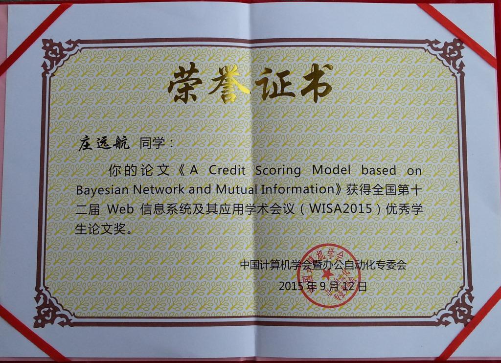 由中国计算机学会主办、IEEE Computer Society协办的第十二届全国Web信息系统及其应用学术会议(2015 12th Web Information System and Application Conference, WISA 2015)于2015年9月11-13日在山东大学成功举行。我校计算机与信息学院许卓明教授指导的计算机科学与技术专业2013级(学术型)硕士研究生庄远航同学的学术论文《A Credit Scoring Model based on Bayesian Network and Mutual Information》获WISA 2015学术会议“优秀学生论文奖”。该论文已由IEEE Press正式出版。