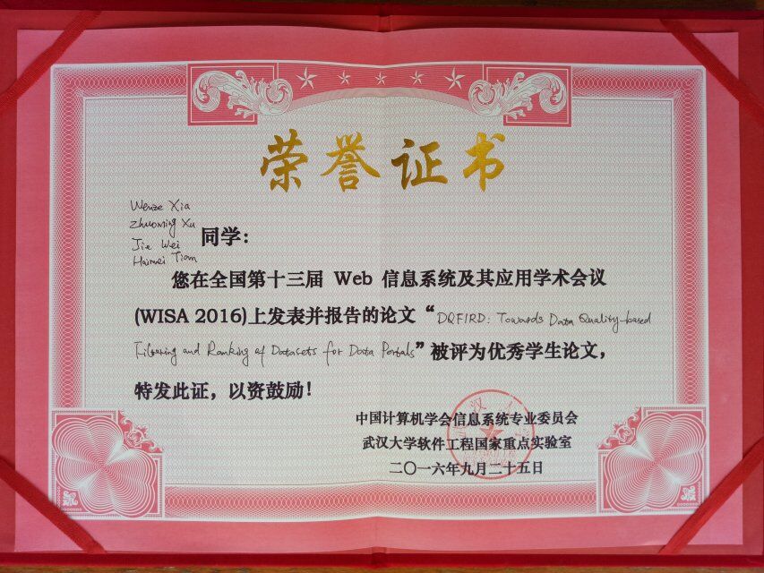 由中国计算机学会(暨信息系统专业委员会)和IEEE Reliability Society共同主办、武汉大学承办、华中科技大学等单位协办的第十三届全国Web信息系统及其应用学术会议(13th Web Information System and Application Conference, WISA 2016)于2016年9月23-25日在湖北武汉成功举行。我院许卓明教授及其研究生参加了本届(WISA 2016)学术会议,并再次在WISA学术会议上荣获“优秀学生论文”奖。本次获奖论文是计算机科学与技术专业2014级硕士研究生夏文泽同学为第一作者的英文学术论文《DQFIRD: Towards Data Quality-based Filtering and Ranking of Datasets for Data Portals》。该论文由IEEE Press出版,将被EI检索。