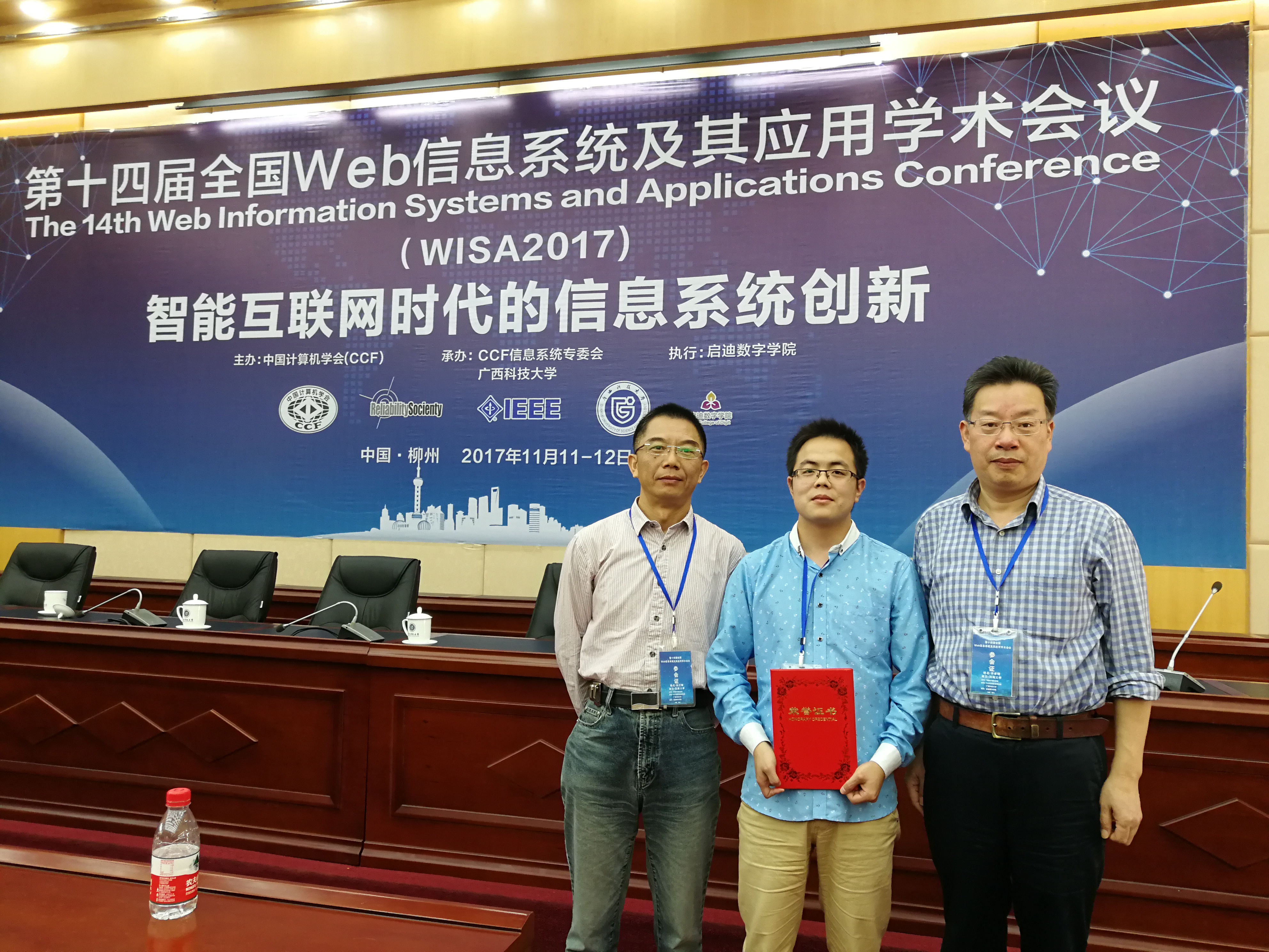 由中国计算机学会(CCF)主办、CCF信息系统专委会和广西科技大学联合协办、国际电气与电子工程师学会(IEEE)赞助的第十四届全国Web信息系统及其应用学术会议(14th Web Information System and Application Conference, WISA 2017)于2017年11月11-12日在广西柳州成功举行。我院许卓明教授和2015级硕士研究生毛承旺同学参加了该学术会议,以该同学为第一作者、导师许卓明教授为通讯作者的英文学术论文 “Asymmetric Item-Item Similarity Measure for Linked Open Data Enabled Collaborative Filtering”再次荣获该学术会议的“优秀学生论文”奖。