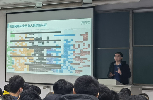 实操的最后一天,山石网科吴运文老师对课程进行了总结,并针对网络安全的跨界交叉融合、知识快速更新等特点,结合美国网络安全从业人员技能认证,向同学们普及了网络安全各细分领域的人才需求和岗位技能要求,消除了同学们对网络安全职责的误解。