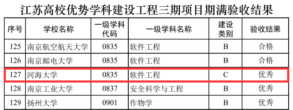 根据《江苏高校优势学科建设工程三期项目管理办法》(苏教研函〔2019〕4号)和《关于做好江苏高校优势学科建设工程三期项目期满验收工作的通知》(苏高建办函〔2022〕1号),江苏高水平大学建设领导小组办公室组织开展了江苏高校优势学科建设工程三期项目期满验收工作,经资金审计、高校自评、初步审查、专家审核、综合认定等程序,信息学部计算机与信息学院软件工程学科验收结果为优秀。