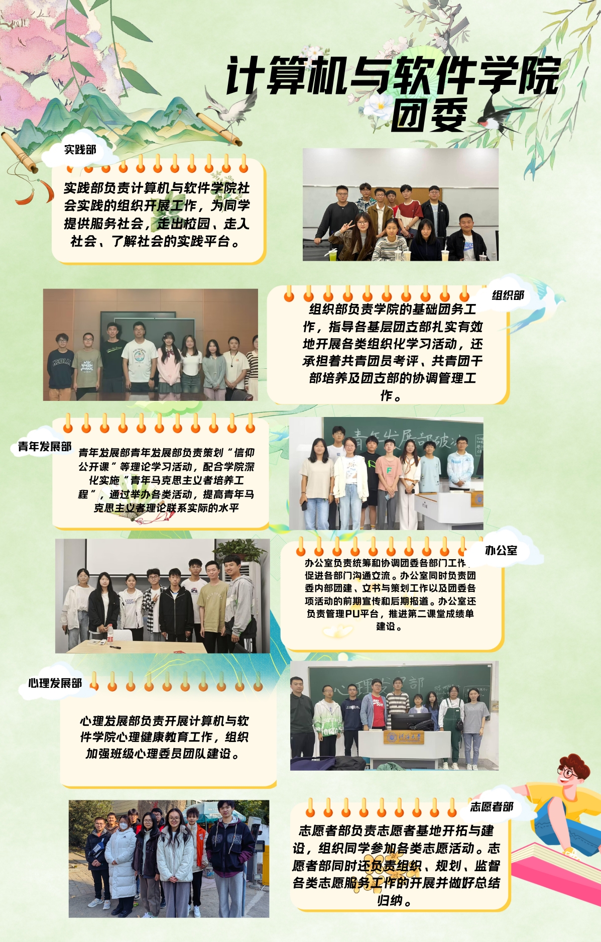 计算机与软件学院团委在学院党委和上级团组织的领导下,聚焦学校团委中心工作,紧跟学院党委建设步伐,发挥学科专业特色,秉承“强基础、重实践、求创新”的人才培养理念,结合团员青年特点,扎实有力开展各项工作。