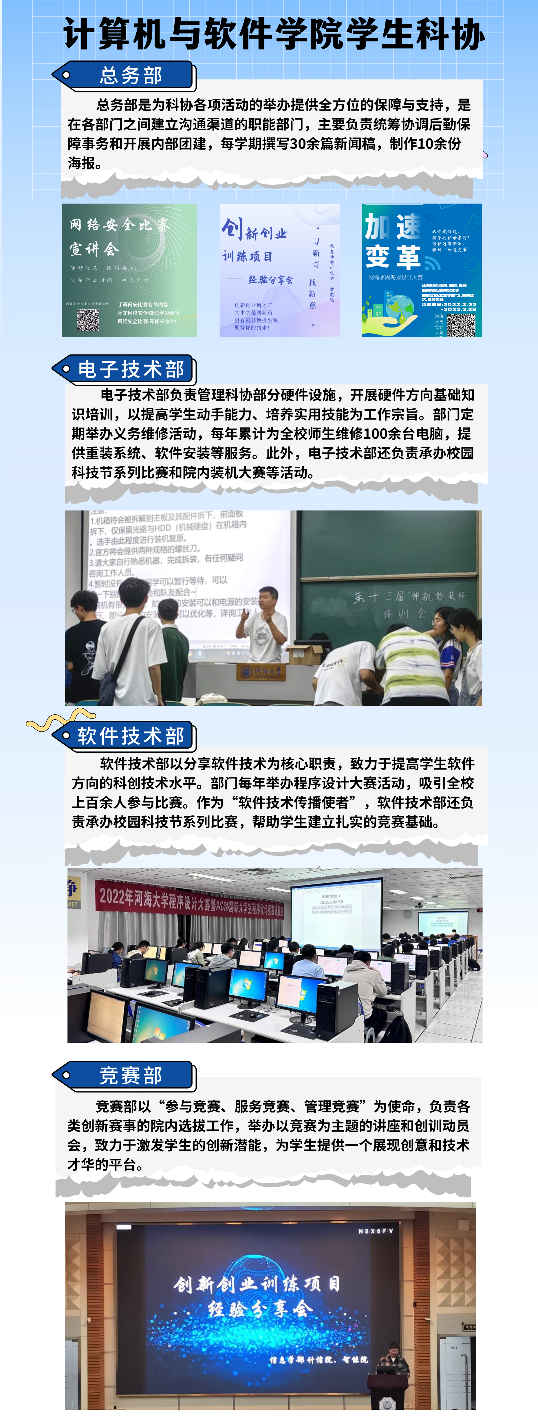 计算机与软件学院学生科协是展现我院学子技术才华的窗口,也为我院学子提供了技术交流和创新探索的平台,共设总务部、软件技术部、电子技术部、竞赛部四个部门,负责组织各类学科竞赛类活动,进一步促进校园科技文化建设。
