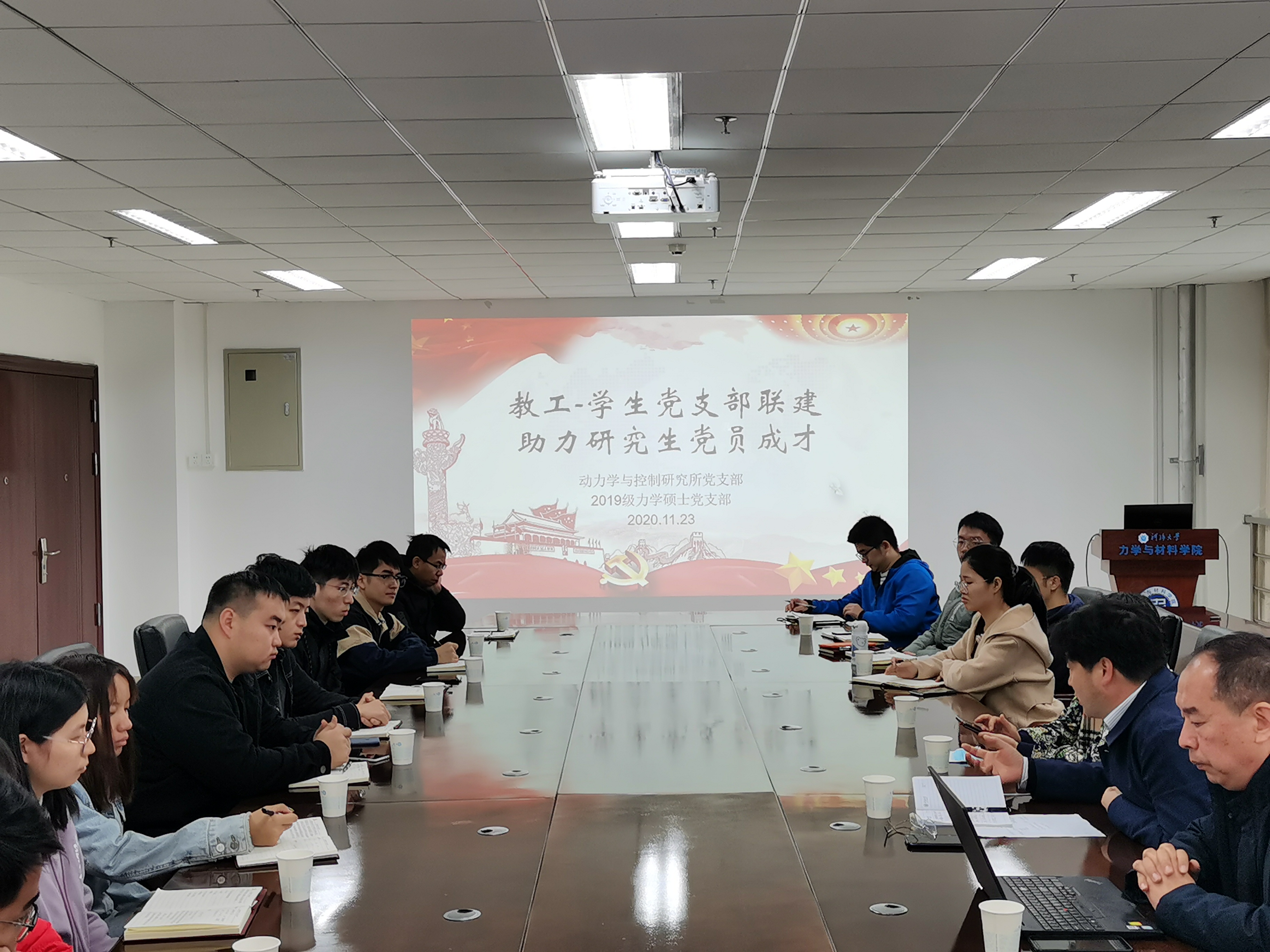 2020年11月23日上午,力学与材料学院召开了“教工-学生党支部联建,助力研究生党员成才”主题座谈会。学院党委杨春伟书记、动力学与控制研究所党支部书记曹茂森教授、全国优秀教师杨海霞教授、部分教职工和博士生代表,以及2019级力学硕士党支部全体党员出席了会议。