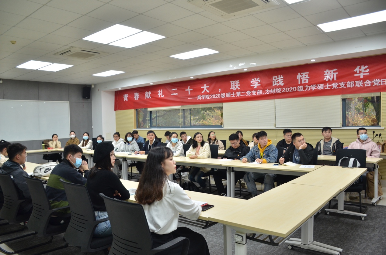 为深入贯彻学习党的二十大精神,将学习落实到强化理论武装、锤炼个人修养、增强个人能力等各方面,促进青年党员在学习、工作和生活上形成行动自觉,引导支部党员同志不断砥砺初心、筑梦强国,争做时代有为青年,2022年11月19日,开云电竞网力学与材料学院2020级力学硕士党支部与商学院2020级硕士第二党支部于博学楼A101联合开展“青春献礼二十大,联学践悟新华章”主题党日活动。力材院2020级力学硕士党支部与商学院2020级硕士第二党支部全体党员参加活动。
