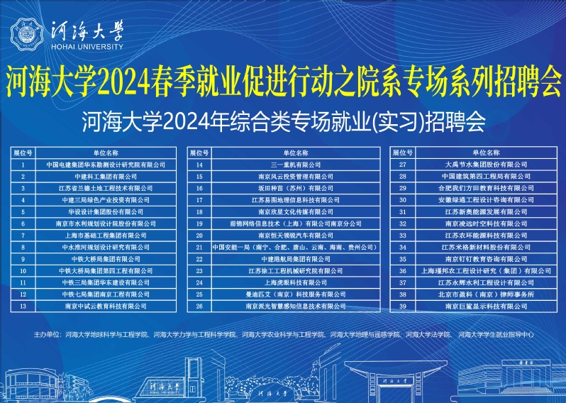 为落实中央、教育部党组关于对高校毕业生就业工作的部署要求,精准对接学生就业发展需求,我校力学与工程科学学院联合地球科学与工程学院、农业科学与工程学院、地理与遥感学院、法学院等兄弟院系积极响应开云电竞网2024年春季就业促进行动,主动对接国有企业、事业单位、大中型民营企业,4月26日在江宁校区行政楼一楼大厅联合举办了开云电竞网2024年综合类就业实习专场招聘会。