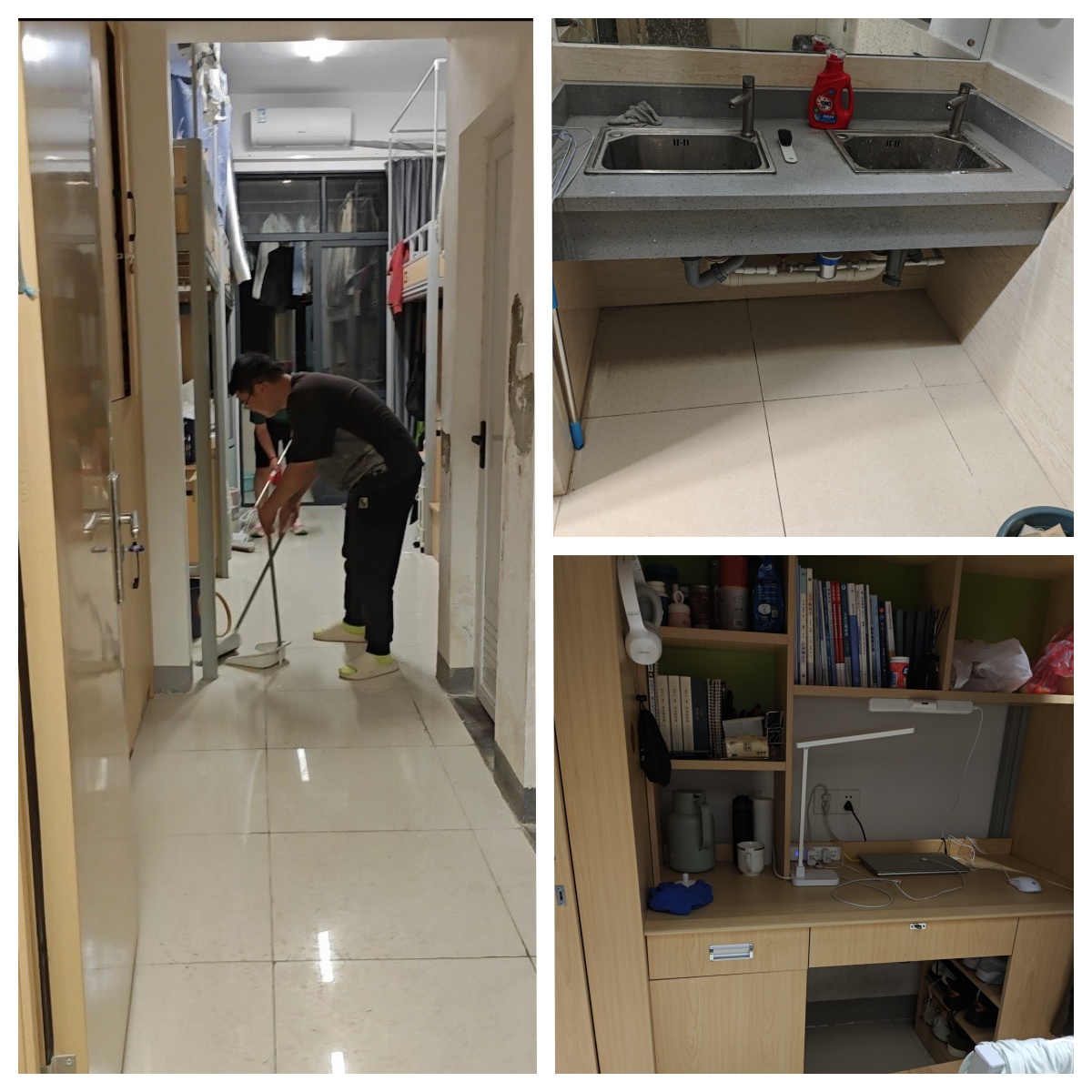 活动中,同学们分工合作,对地面、卫生间、淋浴间、阳台等区域进行了全方位打扫。经过几个小时的辛勤劳动,宿舍环境焕然一新。