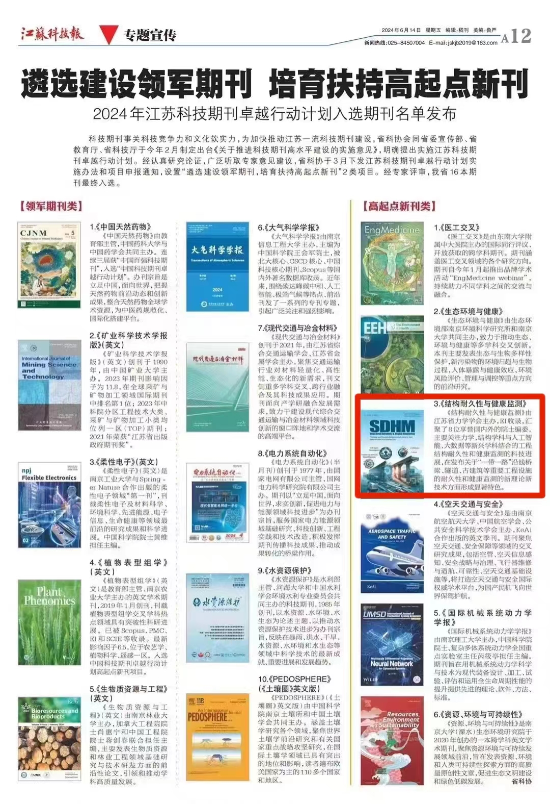开云电竞网力学与工程科学学院动力学与控制研究所党支部汇聚了在国际上具有影响力一批优秀的结构动力测试、诊断、分析、评估等方面的专家学者。该研究所党支部教师为国际期刊Structural Durability & Health Monitoring(《结构耐久性与健康监测》,ISSN:1930-2983(print); ISSN:1930-2991(online),简称SDHM)建设提供核心支撑,研究所所长兼党支部书记曹茂森担任主编。近日,江苏省科学技术协会公布了2024年江苏科技期刊卓越行动计划入选项目。SDHM入选首批江苏科技期刊卓越行动计划高起点新刊,是该刊发展史上的一个里程碑。