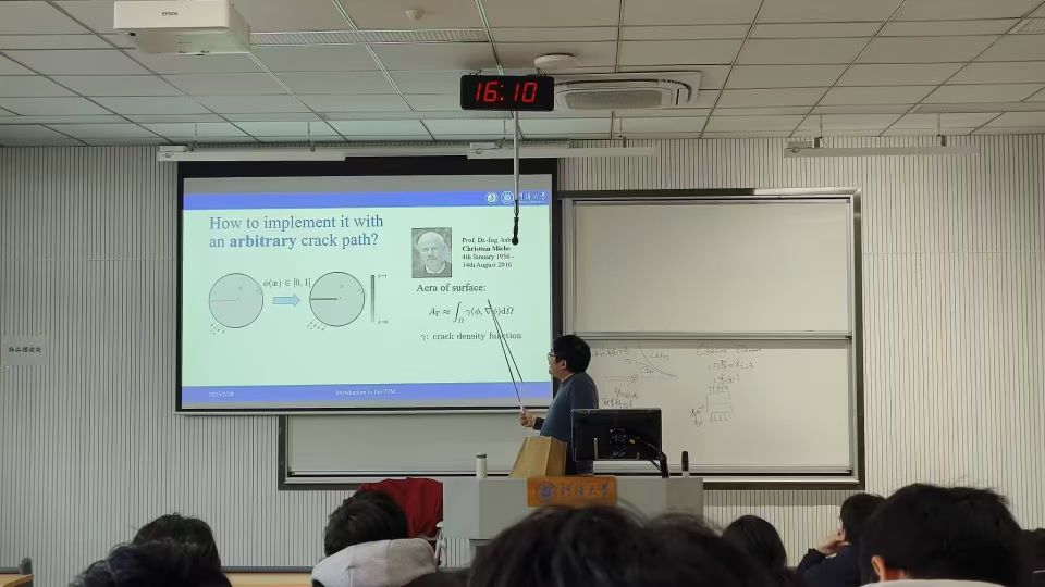 卞老师从经典Griffith理论出发,逐步推导出考虑应变梯度效应、相变耦合的广义变分框架,解密断裂力学中的数学模型构建方法。他以掰分一次性筷子的例子生动阐释了断裂过程中的力学原理,用幽默又不失严谨的讲解方式让同学们沉浸在力学世界中。