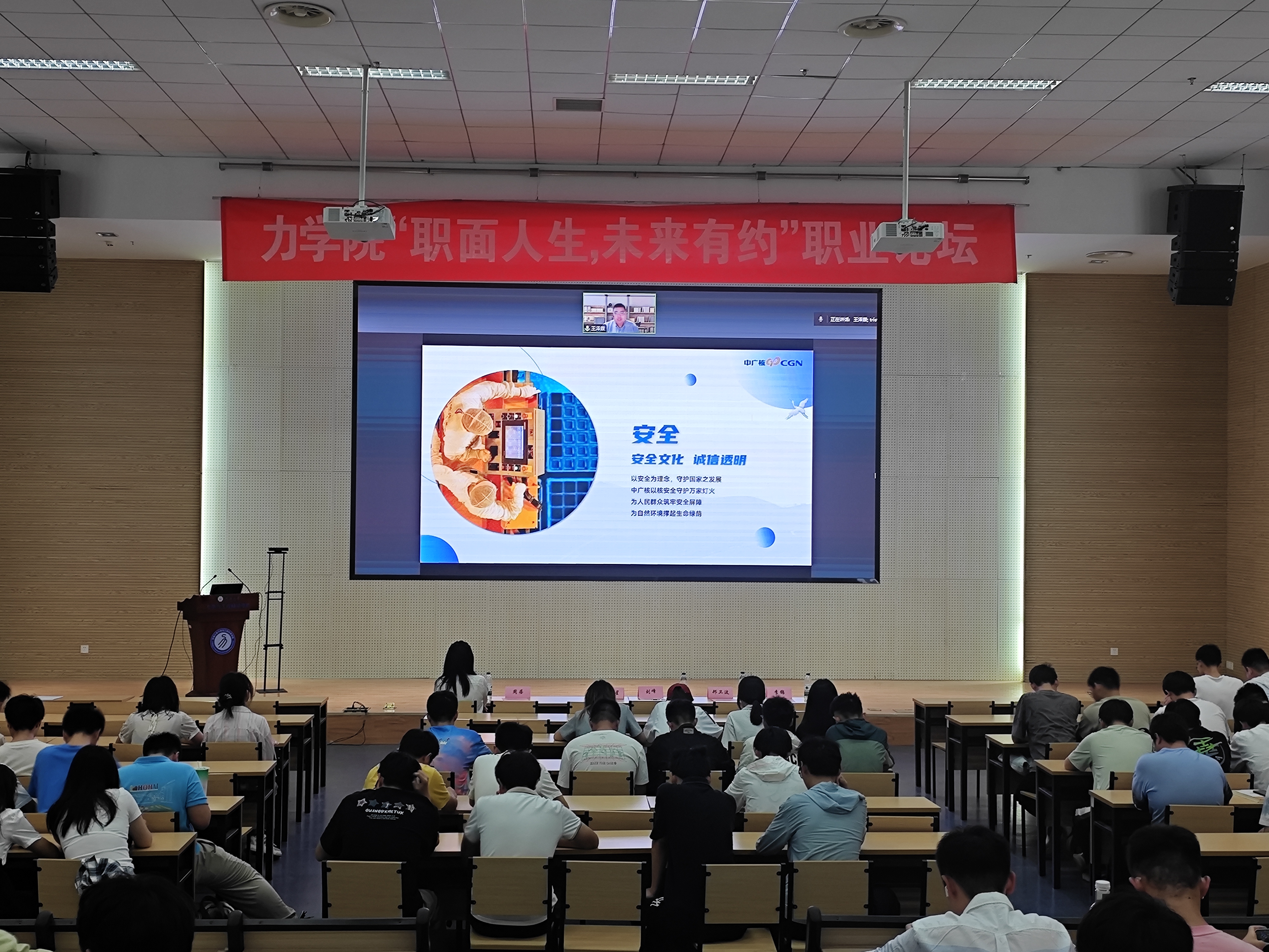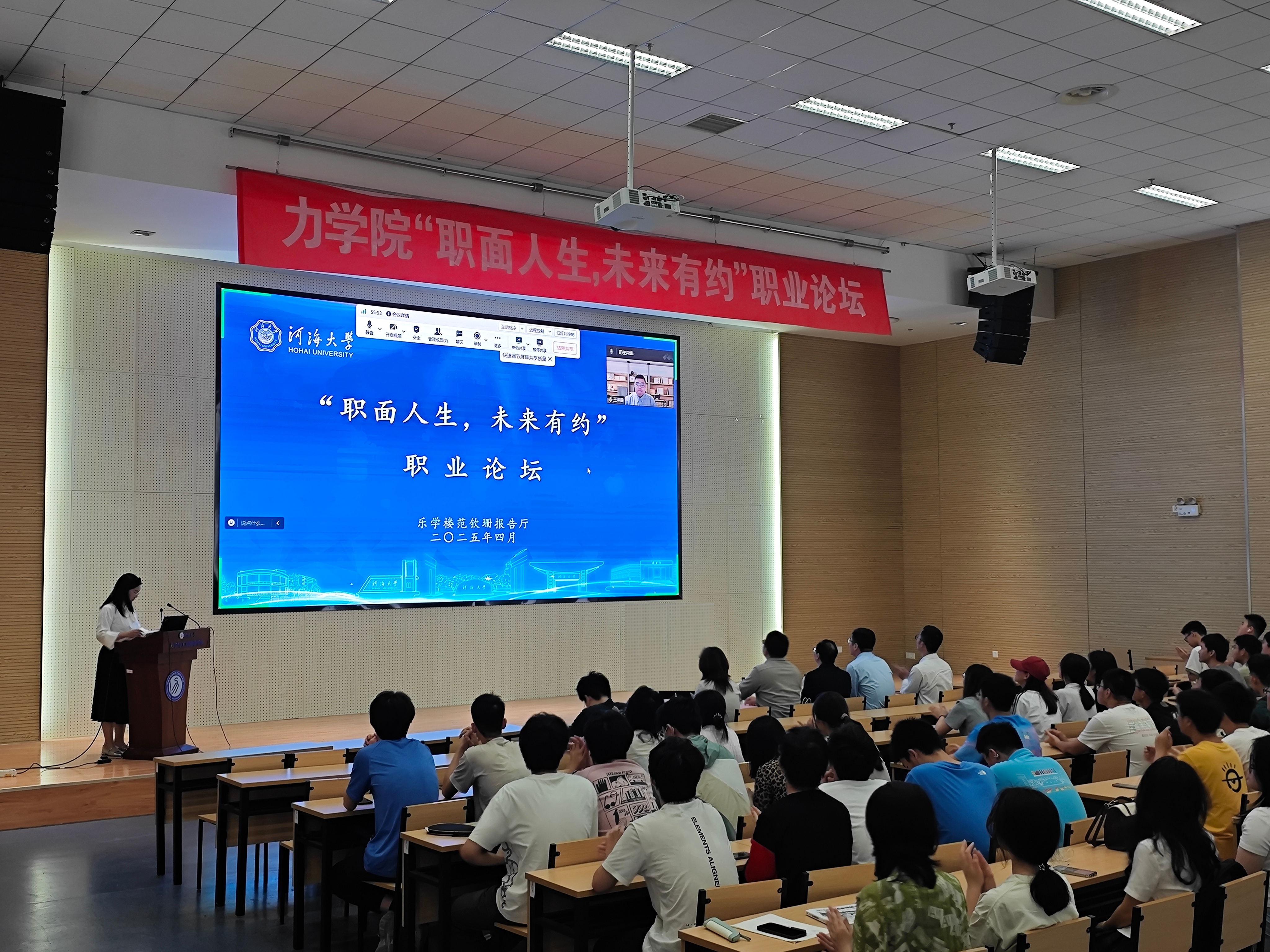 2016届应用物理学校友陈金星回顾了在校学习和步入职场后不断学习成长,增强职业能力的经历,强调了持续学习力和适应变化力在职场中的关键作用。建华控股苏南区域人力资源部刑卫波总经理,剖析当前毕业生就业前景,通过生动案例,希望同学们要提升综合竞争力,为应对未来复杂多变的职场环境做好准备。2022届工程力学校友王泽霖讲述了他在校求学经历以及毕业后的求职过程,鼓励同学们用求真的态度、广阔的胸襟、踏实的作风去应对随时可能出现的变化。