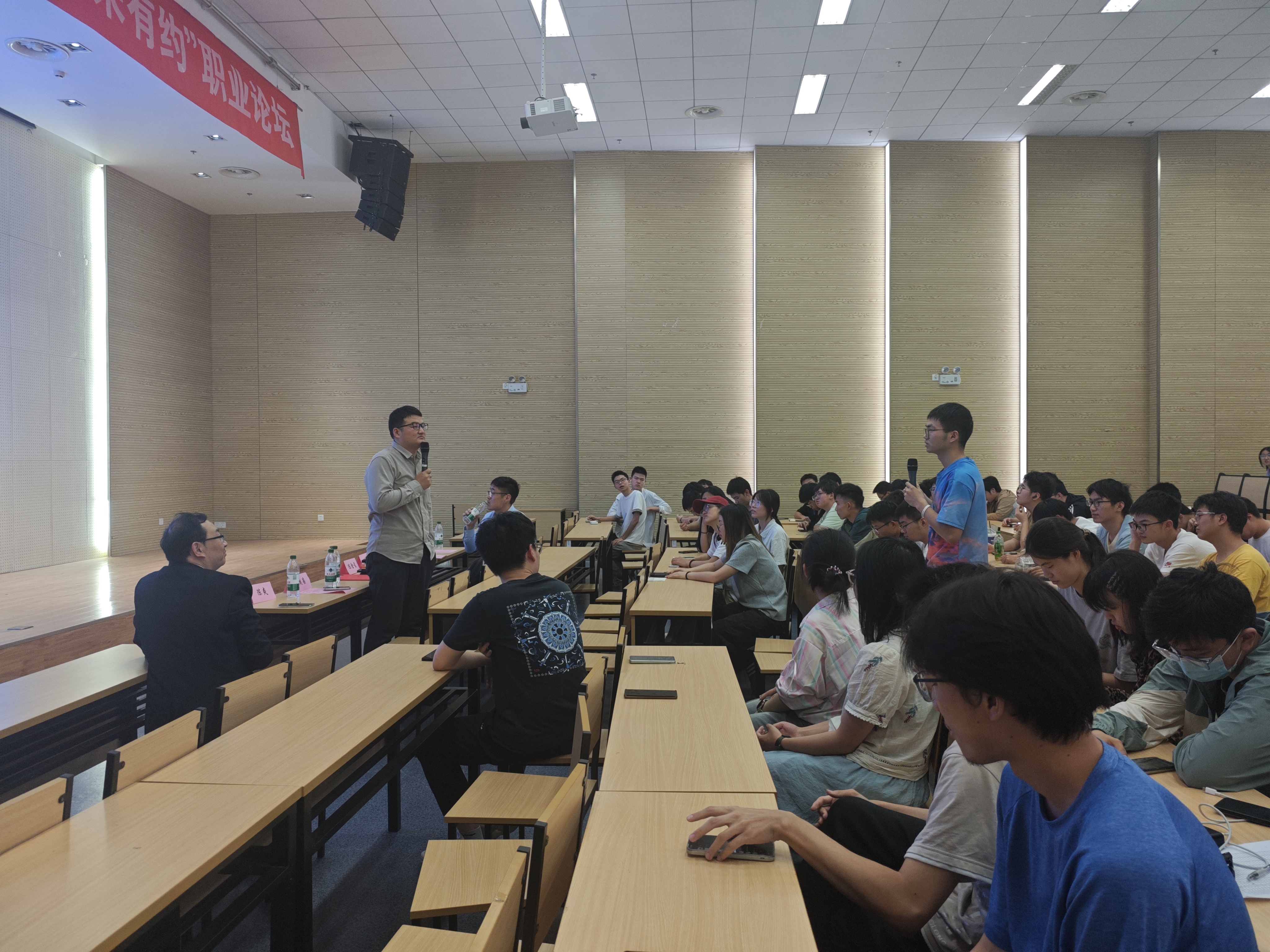 在互动环节,校友嘉宾和同学们就“如何平衡学习和实习”“如何在就业竞争激烈的环境下脱颖而出”等问题展开交流,鼓励同学们在大学期间夯实专业基础,积极参与就业实践项目,有针对性地进行能力提升。