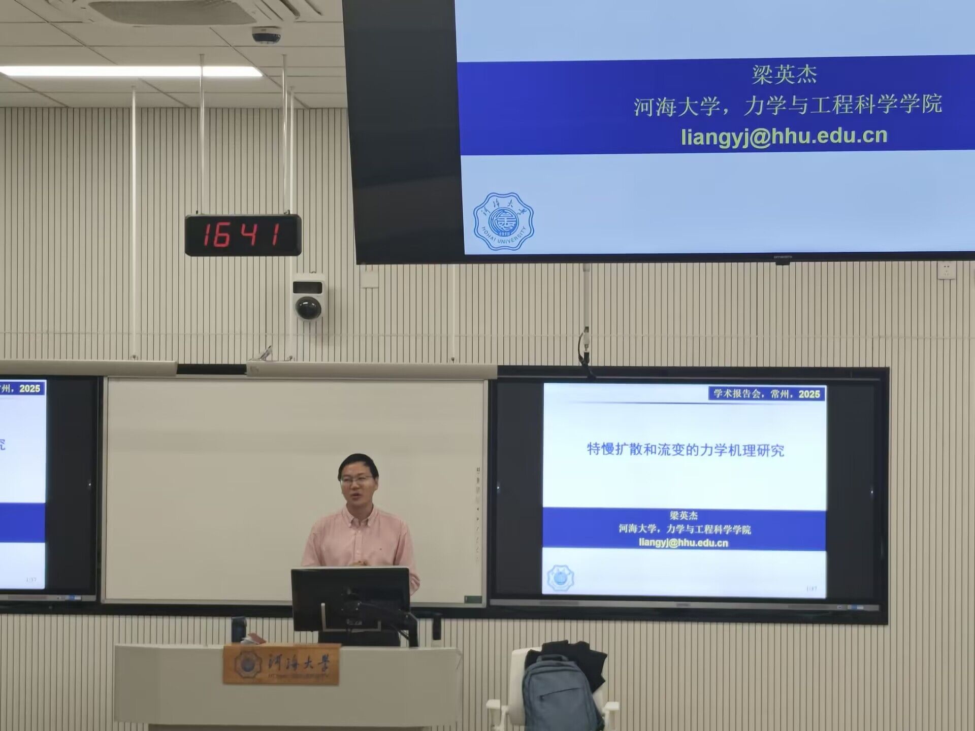 2025年4月22日下午,力学与工程科学学院梁英杰老师在常州校区2号楼C123举办专题学术讲座,分享题为“特慢扩散和流变的力学机理研究”的报告,常州校区40余名研究生、本科生参与讲座。