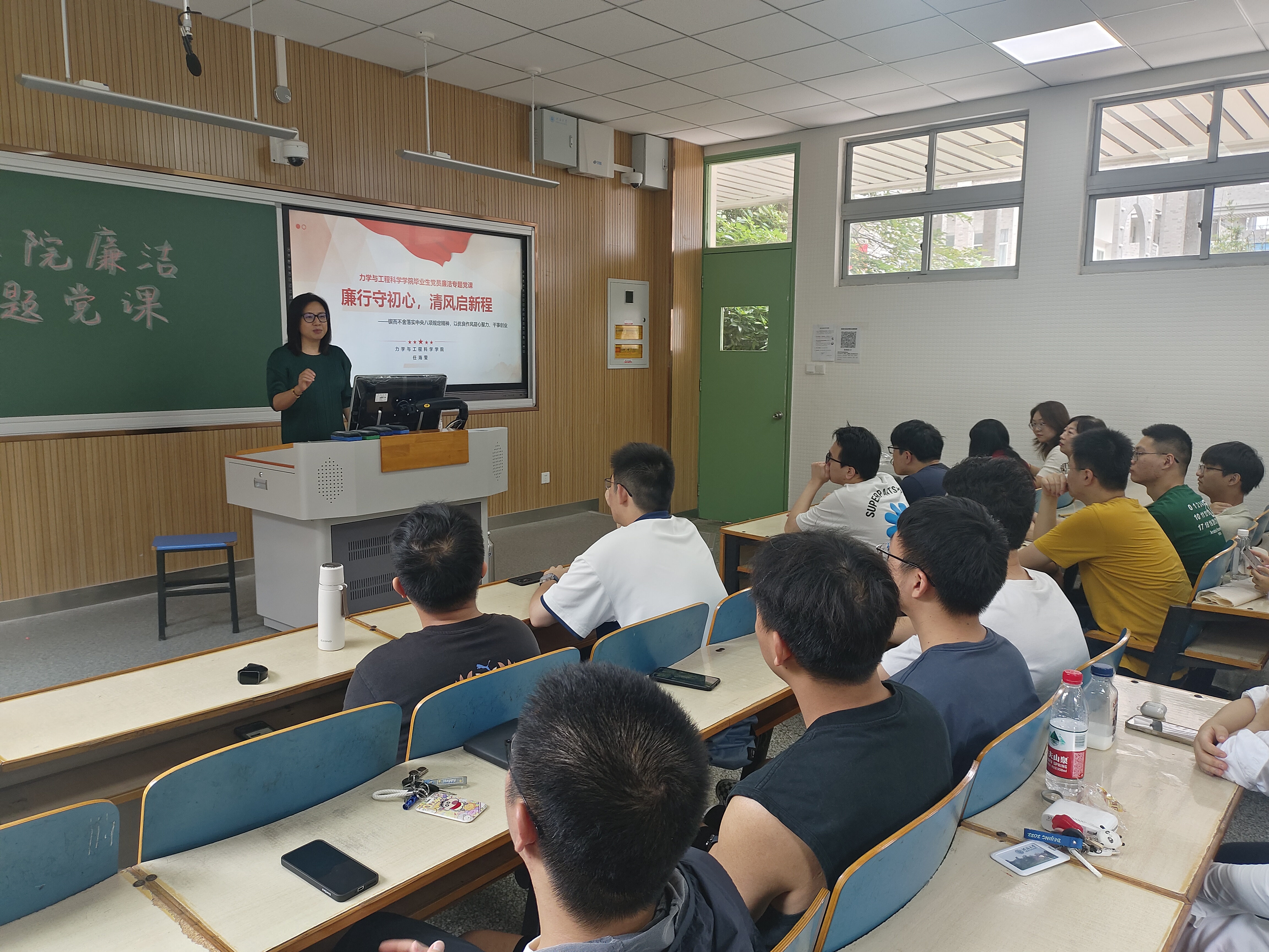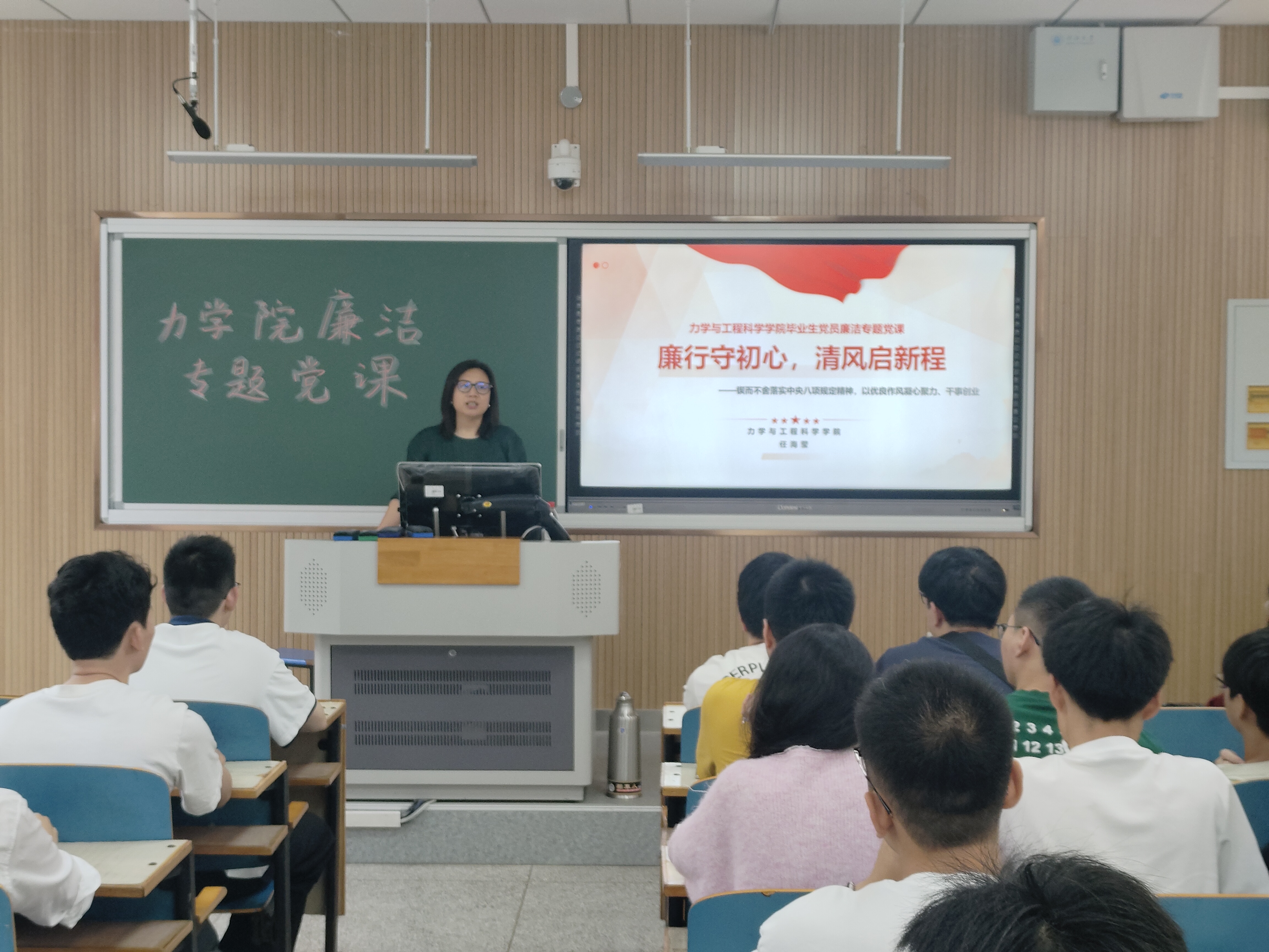 6月13日,力学与工程科学学院党委书记任海莹以《廉行守初心,清风启新程》为题,为2025届毕业生党员讲授廉洁专题党课。学院党委副书记、副院长武晓楠,团委书记陈爽、工程力学专业本科生党支部书记周蓓及全体毕业班党员参加。