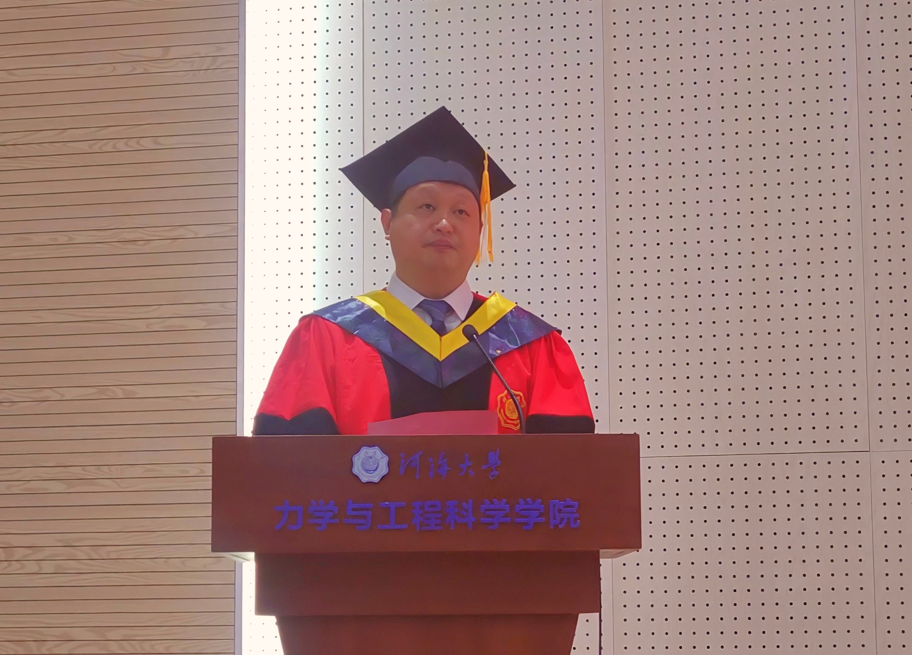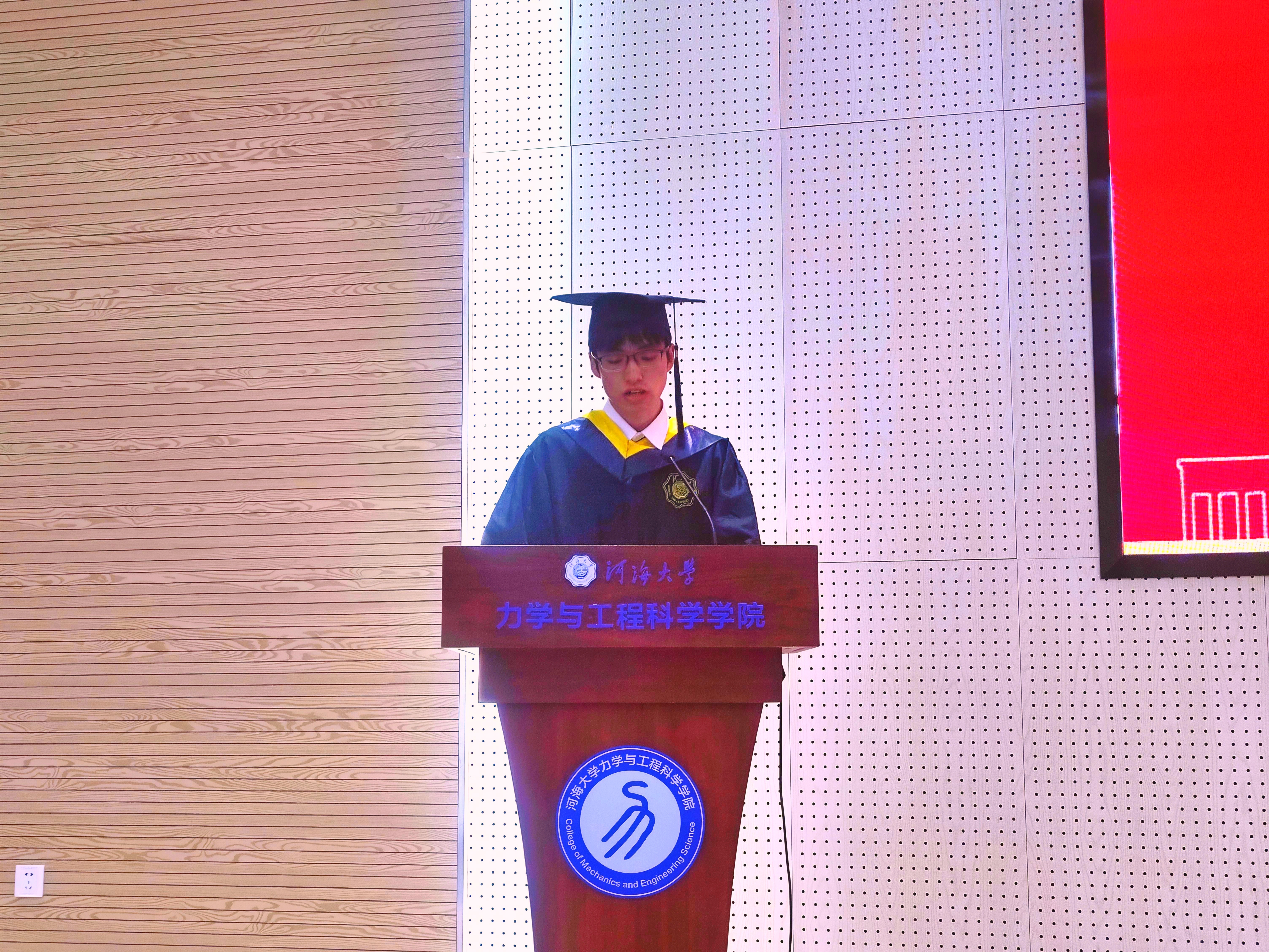 毕业生代表李靖回顾了大学四年在河海的成长与收获,表达了对母校、师长和家人的感恩,他表示,在新的人生起点上,将不负师长殷切期望,始终践行“力学笃行,格物明理”的院训精神,为实现中国式现代化贡献青春力量。