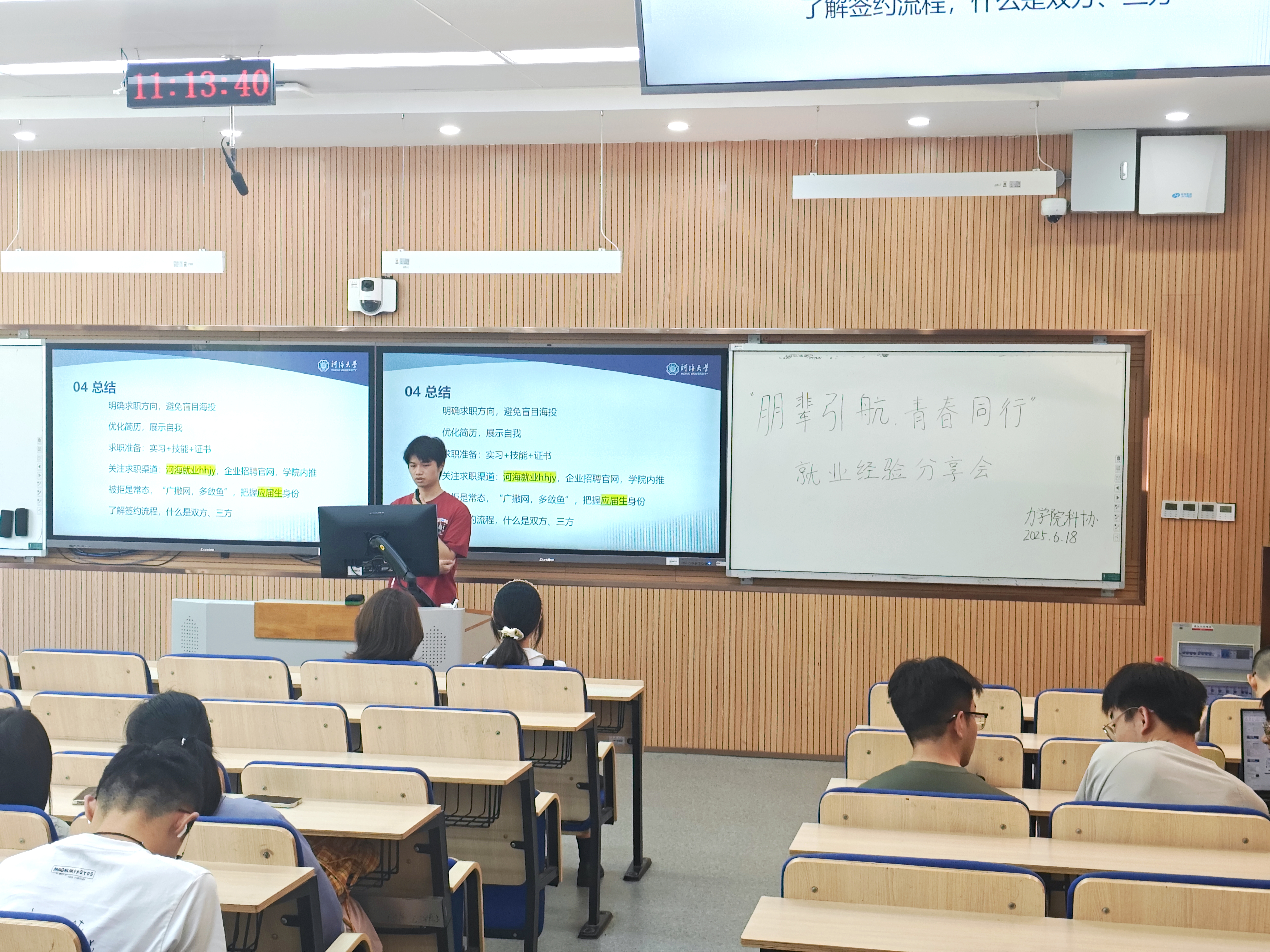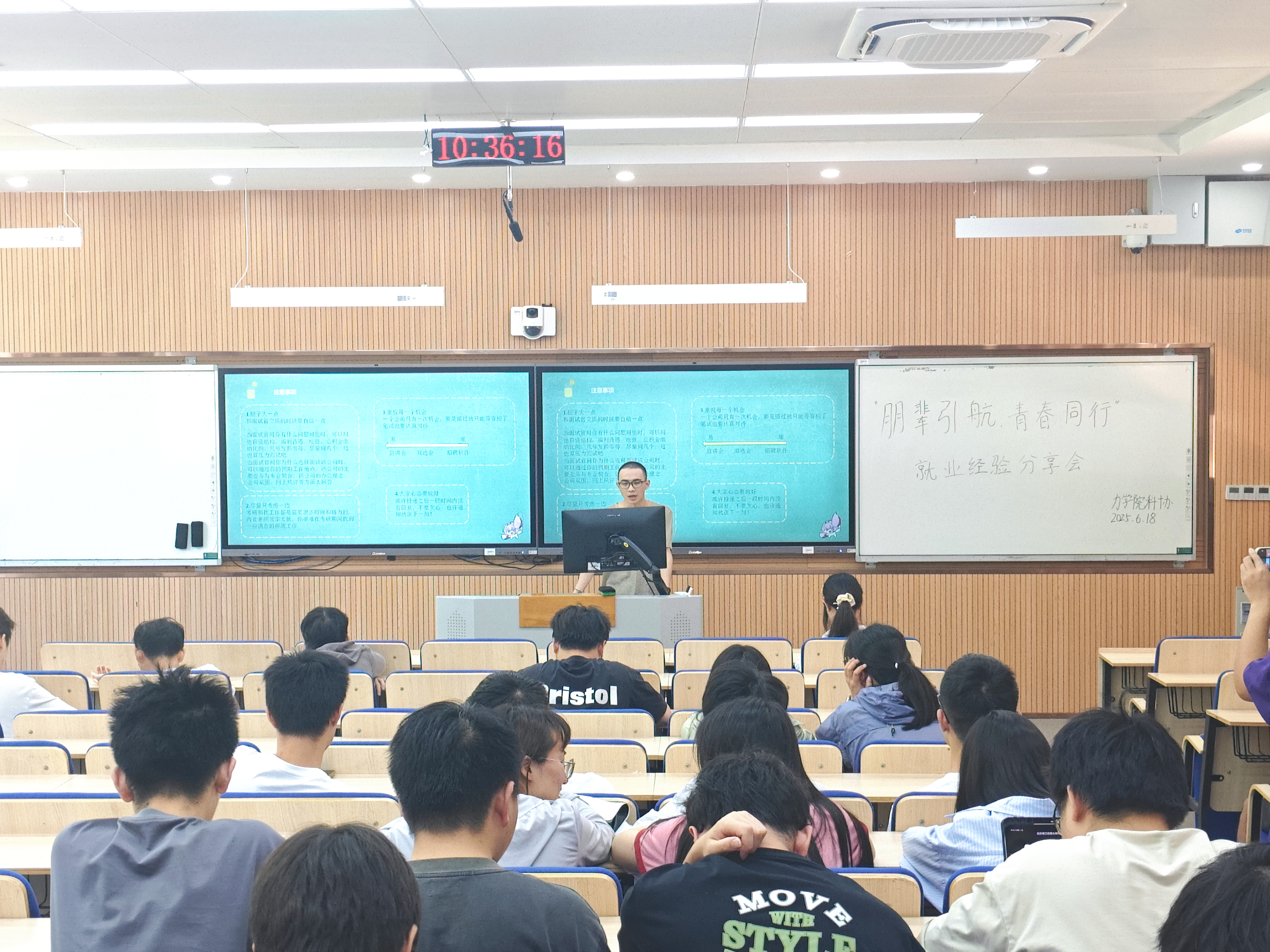 为深入学习贯彻习近平总书记关于青年工作的重要思想,落实“共青团促进大学生就业行动”,引导大学生立足实际、找准定位,树立理性、平实的择业观、就业观,提升积极的就业意识,助力毕业生高质量就业,学院团委于6月19日在江宁校区致用楼120教室举办了“朋辈引航,青春同行”就业经验分享会暨“大学生就业引航”主题团日活动,邀请了2022级硕士研究生徐焱明、范思圆和2021级工程力学本科生唐新、汪波波4位优秀毕业生与同学们面对面开展经验交流。2026届本科生、研究生参与本次活动。