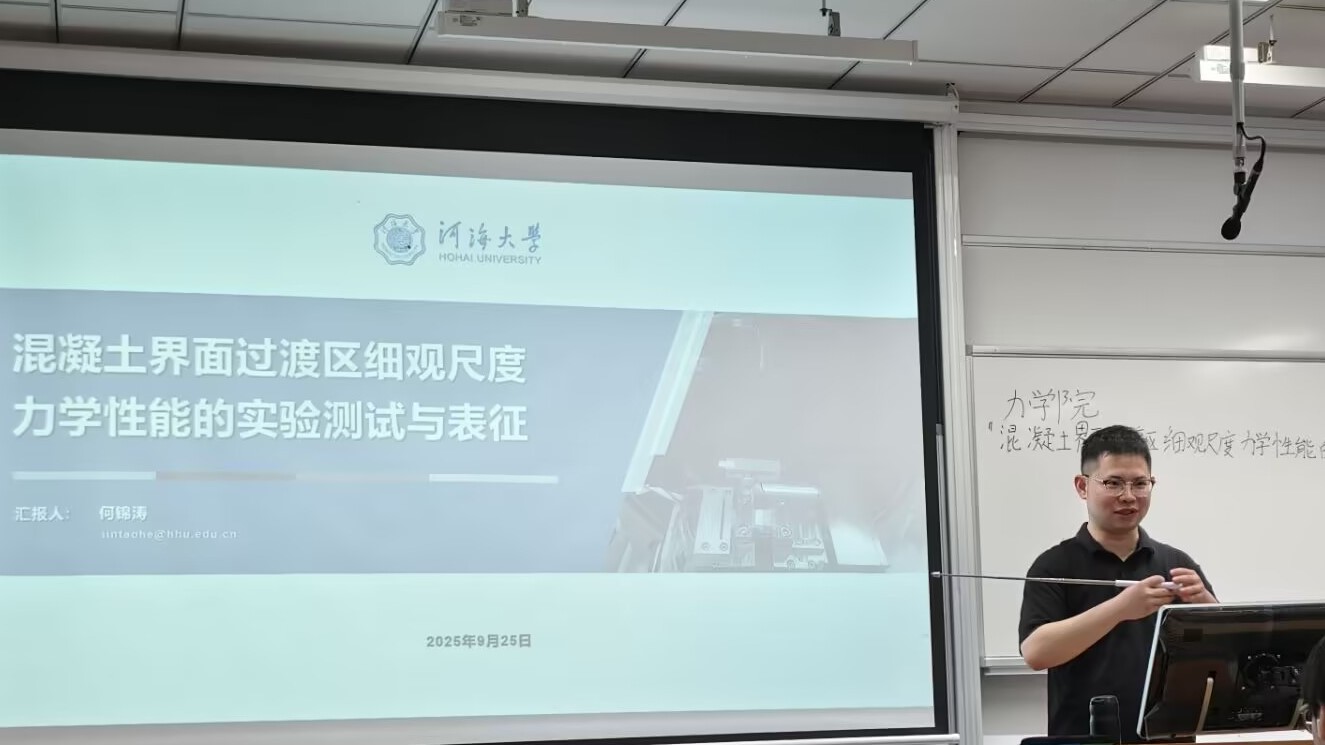 2025年9月25日晚,力学院何锦涛老师在开云电竞网常州校区作题为“混凝土界面过渡区细观尺度力学性能的实验测试与表征”的专题学术讲座。常州校区50余名本科生参加本次讲座。