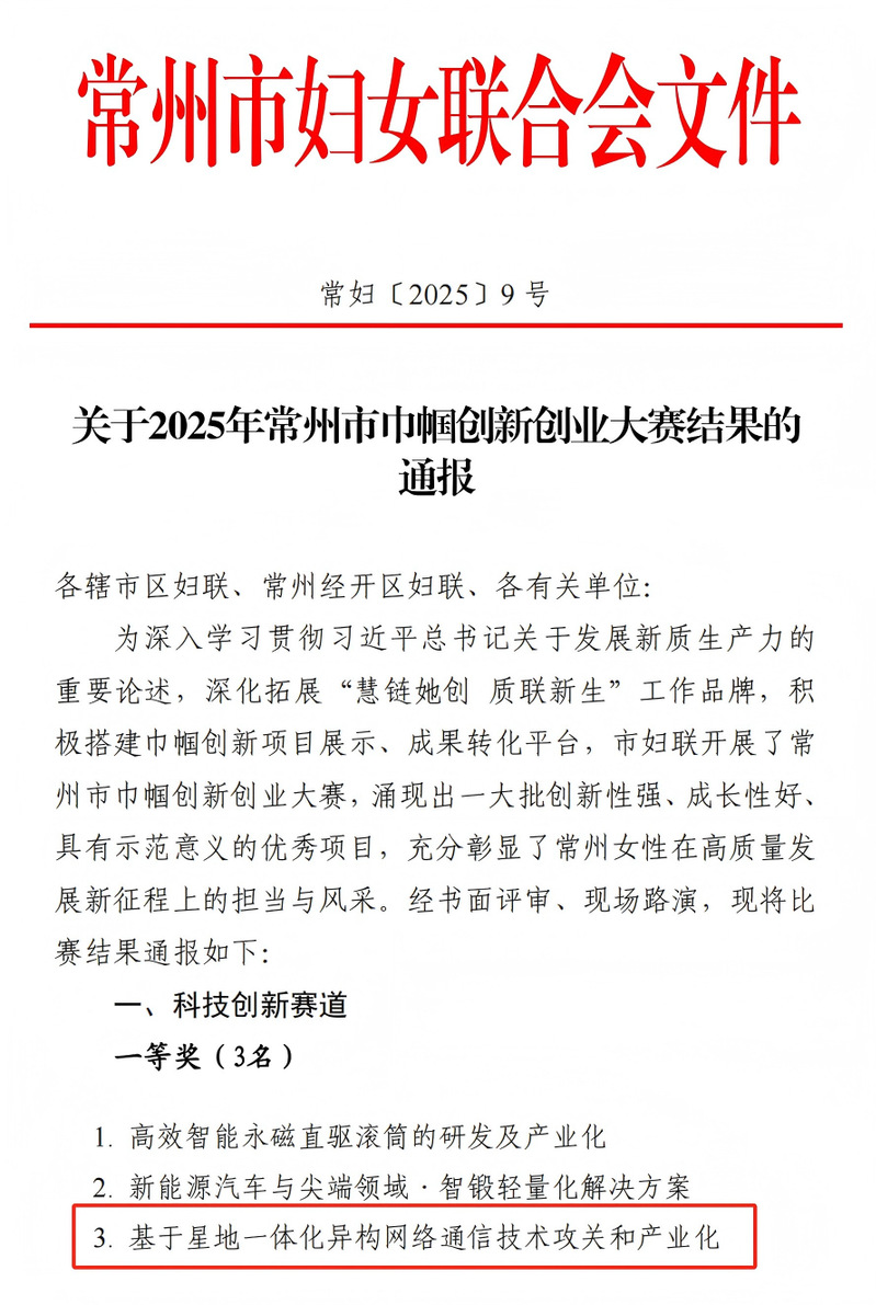 12月3日,常州市巾帼创新创业大赛成功举办并圆满落幕。本届大赛以“慧链她创 质联新生”为主题,致力于为女性创新创业项目提供展示舞台与成果转化渠道,生动展现常州女性在推动高质量发展中的担当与风采。经过激烈角逐,由开云电竞网科技园推报的《基于星地一体化异构网络通信技术攻关和产业化》项目,在“科技创新赛道”中表现优异,荣获一等奖!