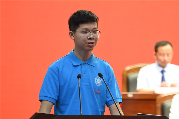 教师代表理学院杨永富副教授和物联网工程学院江金芳副教授对2019级本科新同学表示最热烈的欢迎,并结合自身经历和执教经验,建议同学们在大学阶段要仰望星空,坚定理想;脚踏实地,好好学习;勇于创新、敢于担当。新生代表大禹学院2019级郁张睿龙同学和物联网工程学院2019级梁原同学献辞,表示将牢记河海校训,不负韶光,不忘初心,做努力奔跑的河海追梦人。
