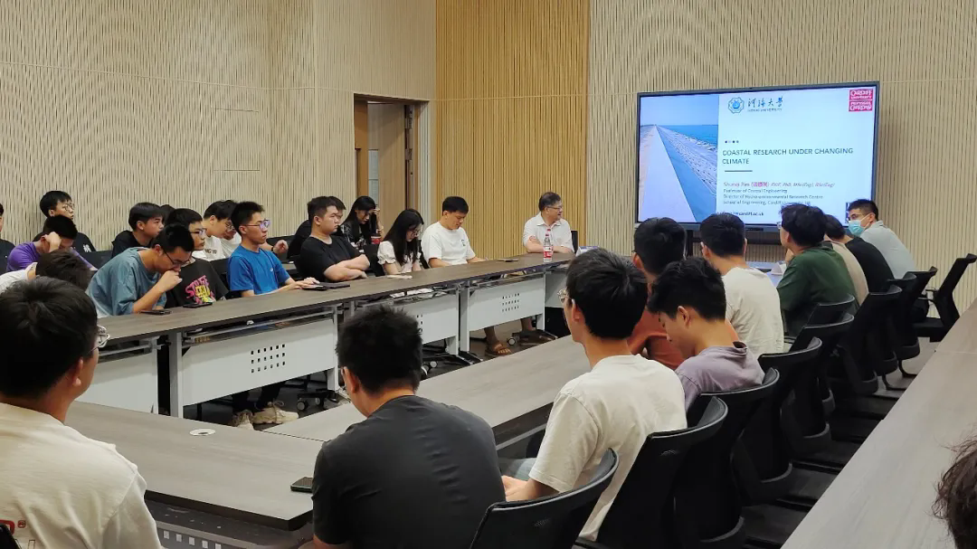 Shunqi Pan教授结合自身丰富的科研经历和行业前沿动态,介绍了气候变化检测技术、气候变化对海岸的侵蚀、最新的海岸线防护方法、气候变化对风能等能源的影响等多方面内容,并表明气候变化下的海岸研究不仅在海岸工程上有重大意义,在社会经济上也有着巨大影响。通过由浅至深的讲解和生动案例分析,使得同学们对于海岸线保护研究有了更全面的认识。(信息来源:港航院)