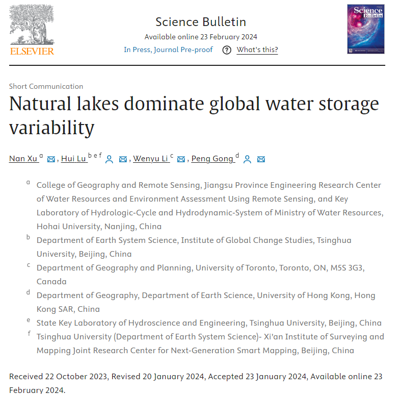 参考文献:N. Xu, H. Lu, W. Li, P. Gong, Natural lakes dominate global water storage variability, Science Bulletin (2024). https://doi.org/10.1016/j.scib.2024.02.023
