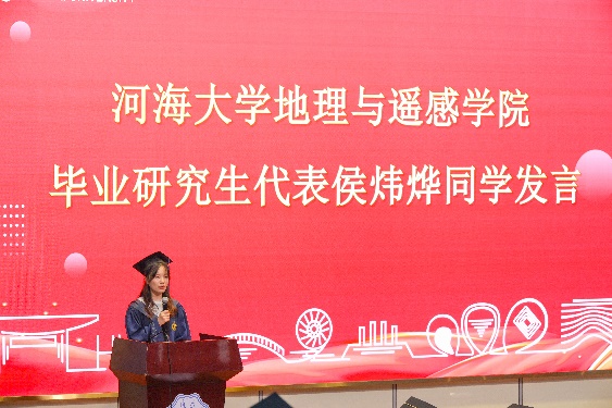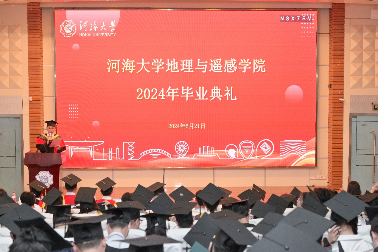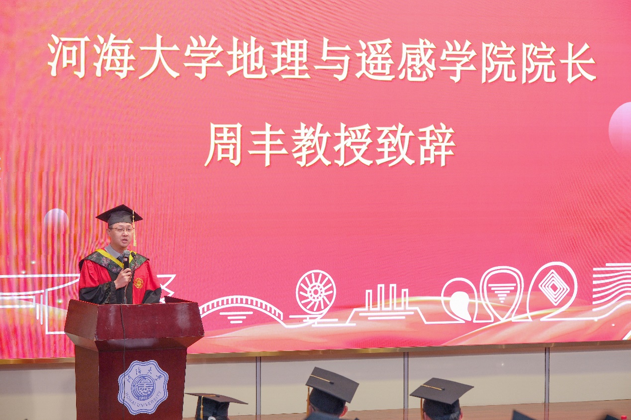 院长周丰教授代表学院向全体毕业生寄语。周院长回顾了毕业生们在河海度过的青春岁月,那些与地理为伴、与梦想同行的日子,仿佛就在昨日。面对地理院的首届毕业生,周院长不禁发出了“河海新百年,地理开新篇”的美好愿景。对此,他向毕业生们提出了3点期望,“立大志、做栋梁”,作为地理院的毕业生,应积极投身基础研究,努力成为推进中国式现代化发展的能动力、创造力;“能吃苦、肯奋斗”,希望毕业生们能够吃苦耐劳、勇往直前,面对未来的挑战时能够迎难而上、勇攀高峰;“懂感恩、有大爱”,希望毕业生们能够懂得感恩、有大爱,用自己的行动回报社会、报效祖国。