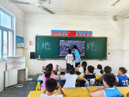 支教团队精心策划了丰富的特色活动。地理院学子发挥专业特长,准备了“地心引力”趣味课堂。课堂上,支教队员运用地图、模型和多媒体工具,以孩子们喜闻乐见的形式,讲解了地球的构造、地形地貌、气候类型等基础知识。孩子们在老师的引导下,积极参与互动,通过亲自实践在地图上寻找学校和家的位置。随后,他们热情参与到了“画一画我家的地图”的活动中,用自己的画笔描绘出了心中的家园。孩子们在老师的指导下,认真观察自己生活的环境,从房屋、道路到河流、山川,每一幅作品都充满了个性和创意。他们用色彩和线条记录下了家乡的自然景观和人文特色,每一张地图都是对家乡独特魅力的一次深情告白。