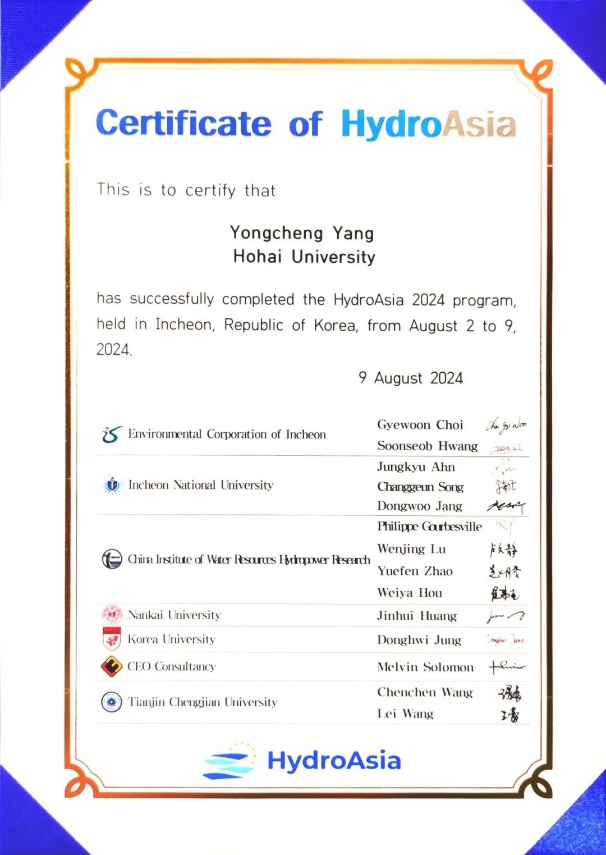 2024年8月,HydroAsia2024课程研修活动在韩国国立仁川大学(INU)成功举办。我院2023级自然地理学硕士研究生杨勇成同学,作为我院学生代表,全程参与了此次活动,展现了河海地理学子的风采。