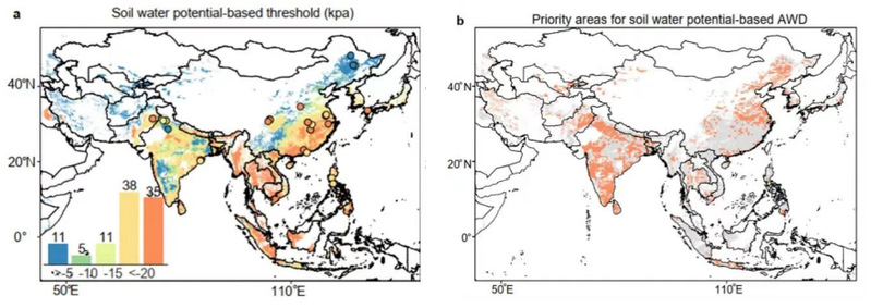 针对上述问题,研究团队开展全球稻田干湿交替灌溉控制试验的数据挖掘,发现灌溉间歇的最低土壤水势是决定AWD如何影响水稻产量的关键指标。在此基础上,综合应用深度学习、过程模型与控制试验数据,绘制了亚洲稻田干湿交替灌溉土壤水势阈值图。与国际水稻研究所推荐的AWD模式相比,该团队提出的新模式实现水分利用效率在全球37%的水稻灌溉面积显著提高且保障水稻稳产,其中印度、孟加拉和中国长江下游等国家或地区是优先推广区,为进一步优化亚洲稻田(约占据全球88%稻田面积)的水分管理提供了科学依据。