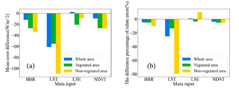 图2 不同输入变量(BBR,宽波段反照率;LST,地表温度;LSE,地表发射率;NDVI,植被指数)空间尺度转换对蒸散遥感反演的误差贡献