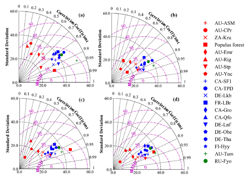 图1 四种方法在全球通量站点处的蒸散测算精度泰勒图(a. NP方法,b. SFE-NP方法,c. RH-PM方法,d. TS-NP方法)