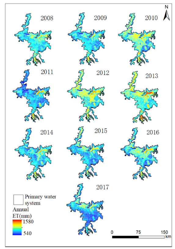 图3 2008-2017年鄱阳湖湿地年蒸散空间分布图