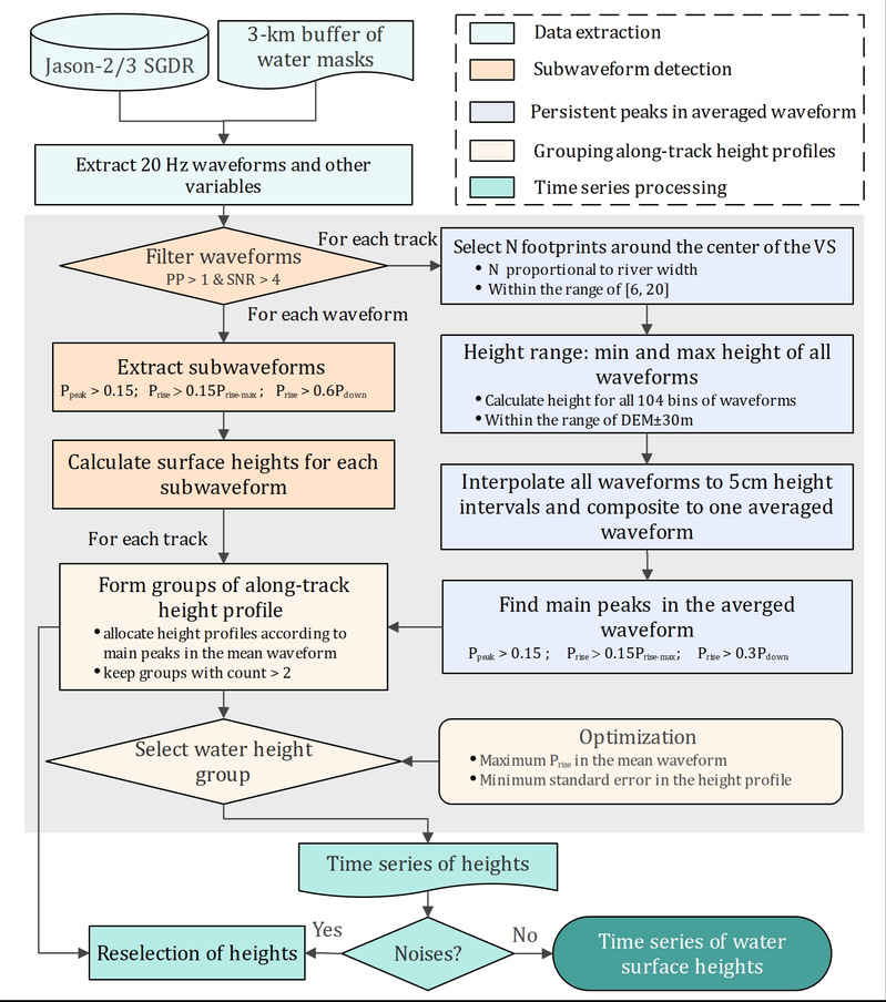 河湖水位是研究地表水存储及其变化、洪涝灾害预警和评估的关键水文参量。基于卫星测高技术提取河湖水位时序可以填补大量无/缺资料区(如高山河源区或中小型河流)的观测空白,为研究地表水动态变化及水资源科学管理提供重要依据。与表面同质的开阔海域相比,内陆水体在雷达高度计的返回波形信号可能受到多个异质反射源(周边背景水体、滨岸地形、人工建筑物等)干扰,导致回波波形呈现多峰分布和高噪声等特征,传统算法无法准确分离和确定目标水体水位信号。近年来提出的水位提取算法,需要人工干预或依赖较多的先验知识作为约束,无法在全球等大尺度应用中有效实施。目前,内陆水体水位产品观测空间密度显著低于卫星轨道覆盖的理论设计密度,限制了卫星测高产品在水文和气候变化研究中的应用。