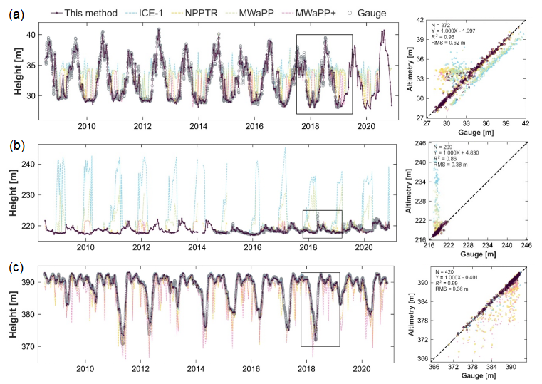 研究提出了一种新的自动化、通用型内陆水体卫星测高反演算法(MPP),实现了对多个持续反射点对应高度信息的分组分离及目标水体水位信号的高精度识别。全球验证表明该方法可以有效提升水位提取的精确性和稳健性(RMSE中位值0.38 m),特别是在地形异质性高的复杂环境,显著优于目前通用的内陆水体水位反演算法。该方法对于于传统雷达高度计和新型SAR测高卫星(如Sentinel-3)均适用,能显著提高内陆水位遥感测高反演精度和观测时空覆盖度。
