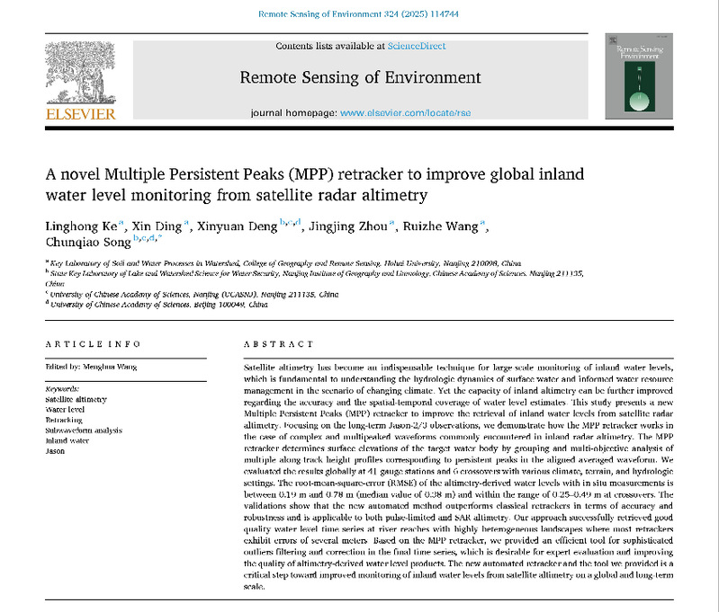 近日,我院柯灵红副教授联合中国科学院南京地理与湖泊研究所提出了基于卫星测高的内陆水体(河流湖库)时序水位提取新方法,该方法在水位监测精度和适应不同地形地貌、水文状况和水体形态等背景条件的稳健性都得到显著提升,并成功研制和发布了全球河湖地表水位长时序产品。该成果以“A novel Multiple Persistent Peaks (MPP) retracker to improve global inland water level monitoring from satellite radar altimetry “为题发表在遥感领域国际权威期刊《Remote Sensing of Environment》。