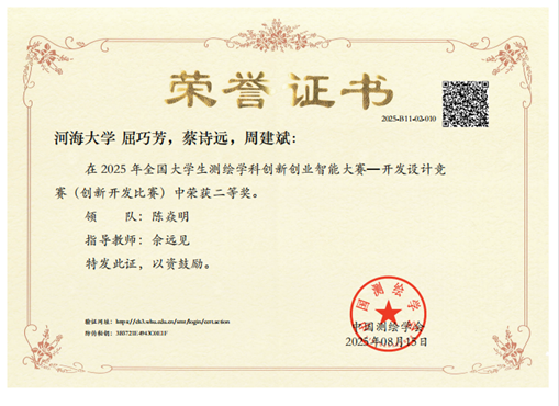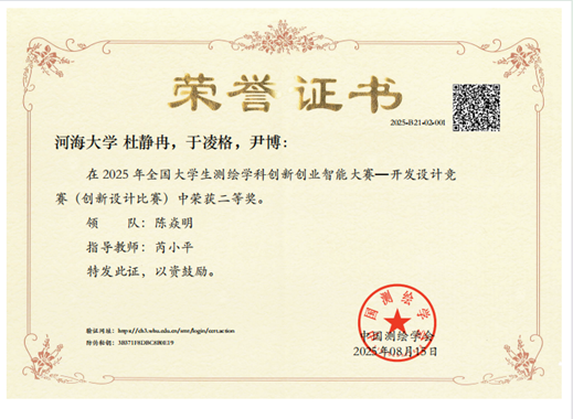 2025年7月31日,由中国测绘学会教育工作委员会主办、内蒙古科技大学承办、南方测绘集团协办的2025年全国大学生测绘学科创新创业智能大赛在内蒙古科技大学举行,经过激烈角逐,我院本科生屈巧芳、杜静冉、李雨姿、蔡诗远、周建斌、于凌格、尹博等多位同学斩获二等奖三项。