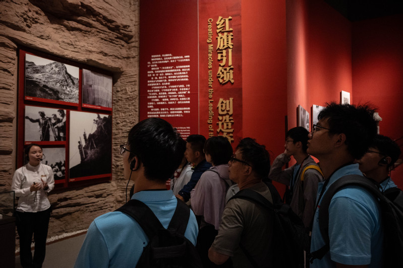 走进纪念馆,一组“凌空除险”的场景复原震撼了所有人:几名修渠民工腰系大绳,悬在数十米高的悬崖上,手持钢钎凿石,脚下是深不见底的峡谷。“当时没有安全绳,就用麻绳;没有机械,就靠人力。”讲解员介绍向实践团成员介绍,为了在绝壁上开出渠线,300多名青年组成“飞虎队”,在零下十几度的寒冬里,吊着绳子在崖壁上作业,不少人手上冻裂的伤口沾了泥水,愈合后又再次开裂。实践团成员肖扬看着场景里民工们补丁摞补丁的衣服,指尖轻轻划过展柜里的钢钎——钎头早已磨平,却仍能感受到当年挥动时的力量。