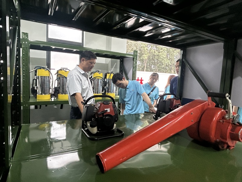随后,团队参观了消防器具库。从风力灭火机、高压水枪到防火服、急救包,队员们逐一了解器具的使用场景与维护知识,还在消防员指导下进行了模拟操作。仓库墙上“森林防火,严禁烟火”的标语,更让大家意识到防灾工作的严谨与重要。